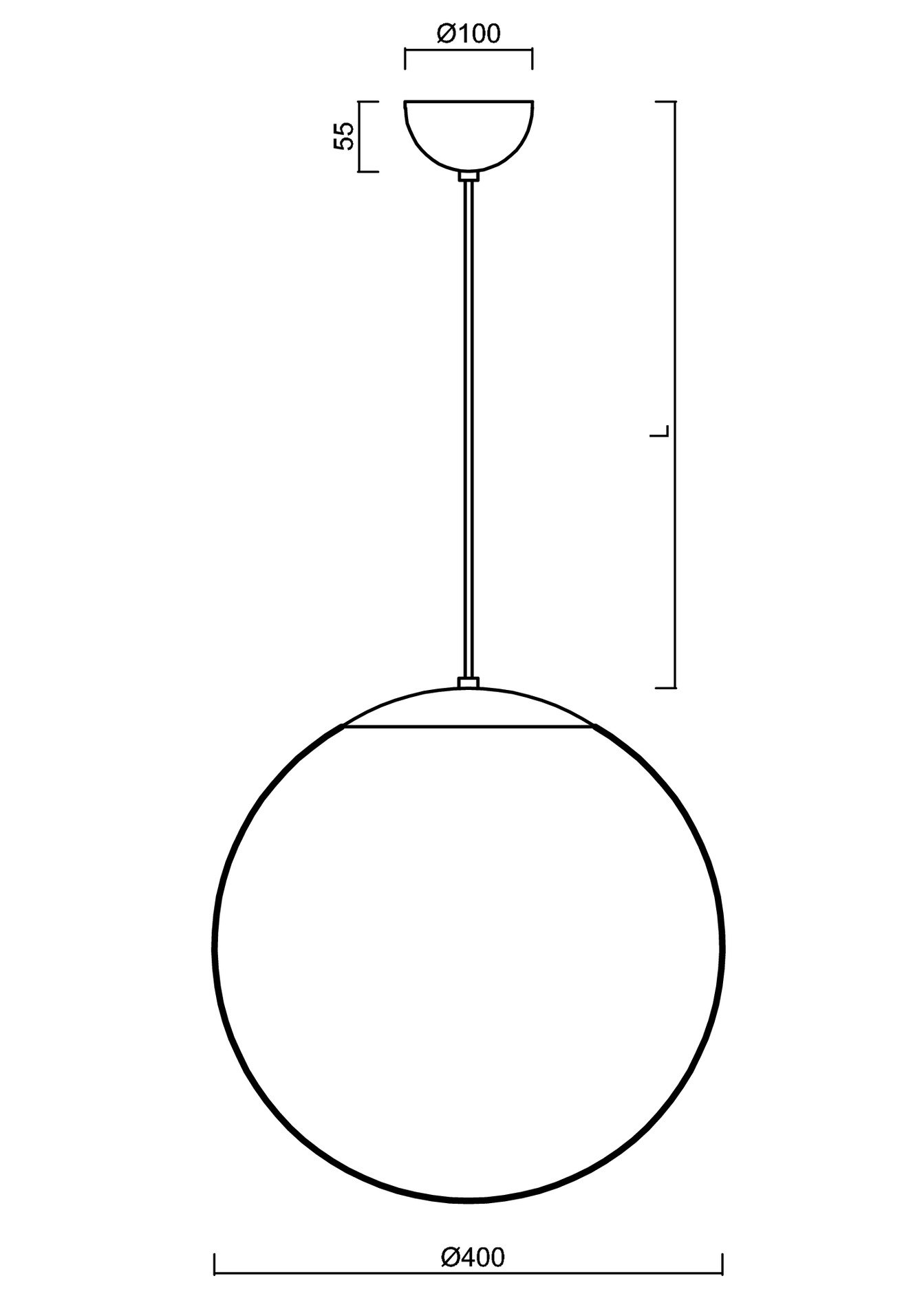Kulaté závěsné svítidlo s průměrem stínidla Ø400 mm. Svítidlo se skládá z kabelového závěsu a PMMA stínidla. Stínidlo je uchyceno ocelovým držákem. Svítidlo je vhodné do interiéru.