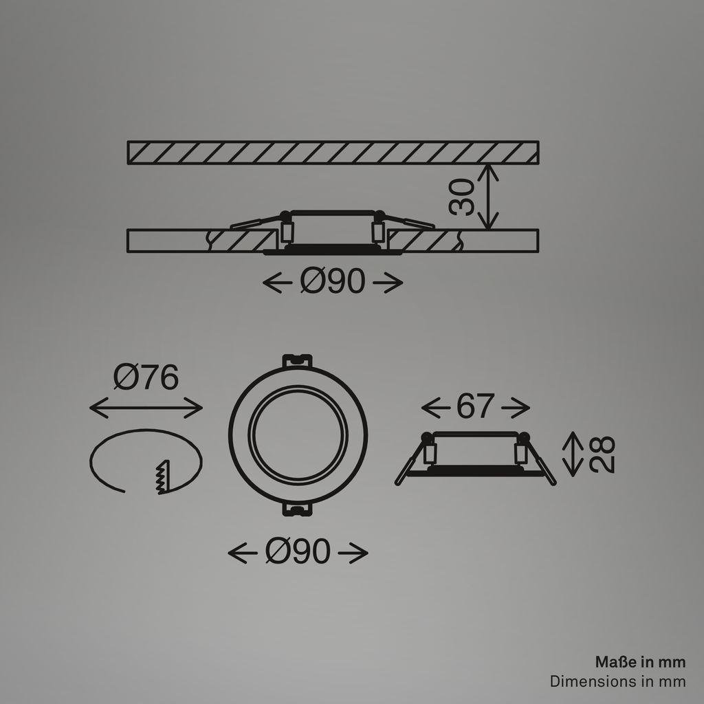 Sada je navržena pro snadné zapuštění do sádrokartonových i podhledových stropů. Stačí otvor o průměru 76 mm, vnější průměr svítidla činí 90 mm. Instalace je rychlá a diskrétní, vzniká čistý, bezešvý detail stropu.