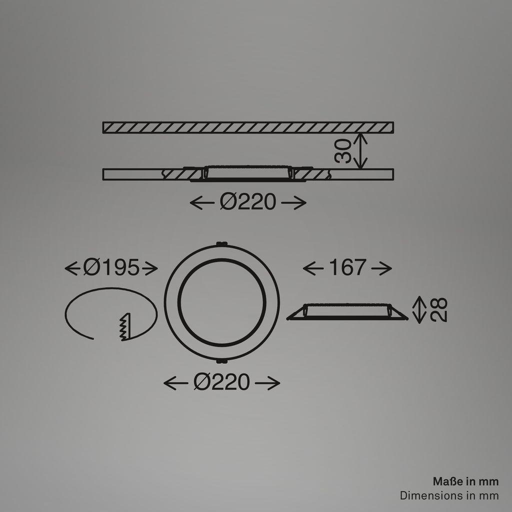 Montáž svítidla je maximálně jednoduchá – otvor o průměru 205 mm a vnější rozměr 220 mm umožňují přesné usazení do podhledu. Díky plochému designu se svítidlo perfektně začlení do každého moderního stropu bez výrazných přesahů.