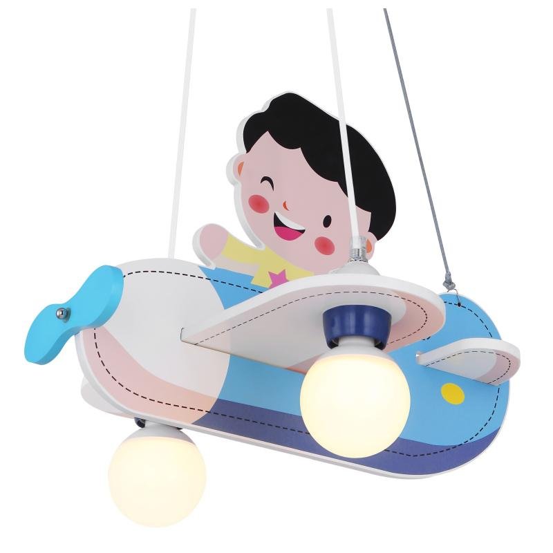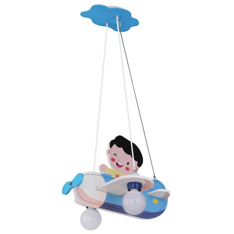 Závěsné svítidlo, dřevo, modrá bílá, plast opál, letadlo s chlapcem, DxŠxV: 430x400x1200, bez žárovek 2xE27, max. 40W 230V.