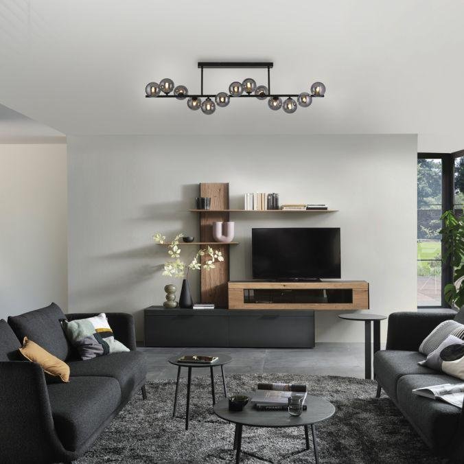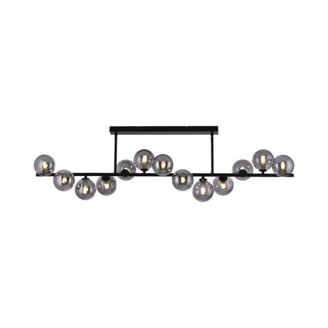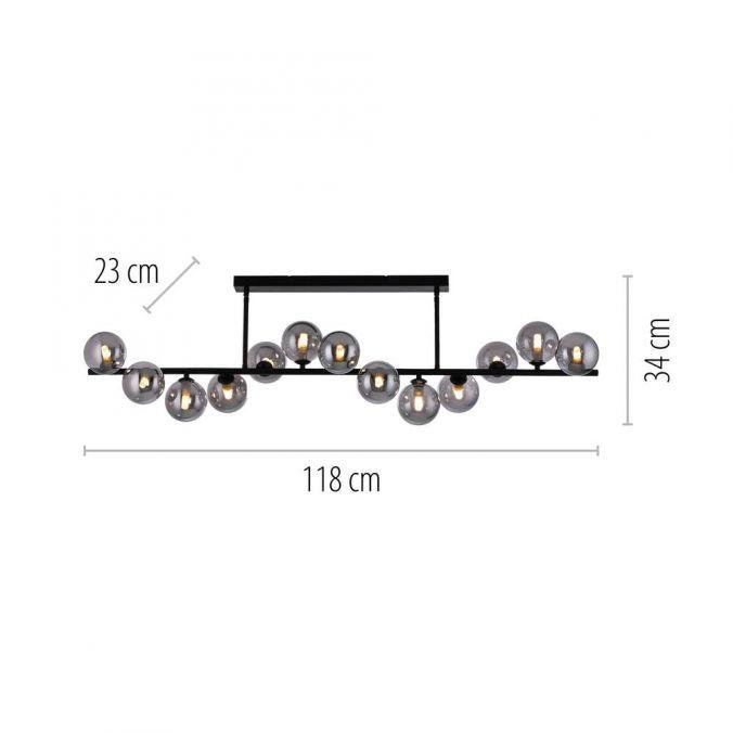 Konstrukce svítidla je tvořena černým kovovým rámem, na kterém jsou pravidelně rozmístěny kouřové skleněné koule. Tyto dekorativní prvky podtrhují moderní charakter svítidla a zároveň zajišťují jemné rozptýlení světla v prostoru. Kombinace černé barvy kovu a kouřového skla působí elegantně a současně vytváří vizuálně zajímavý kontrast.
