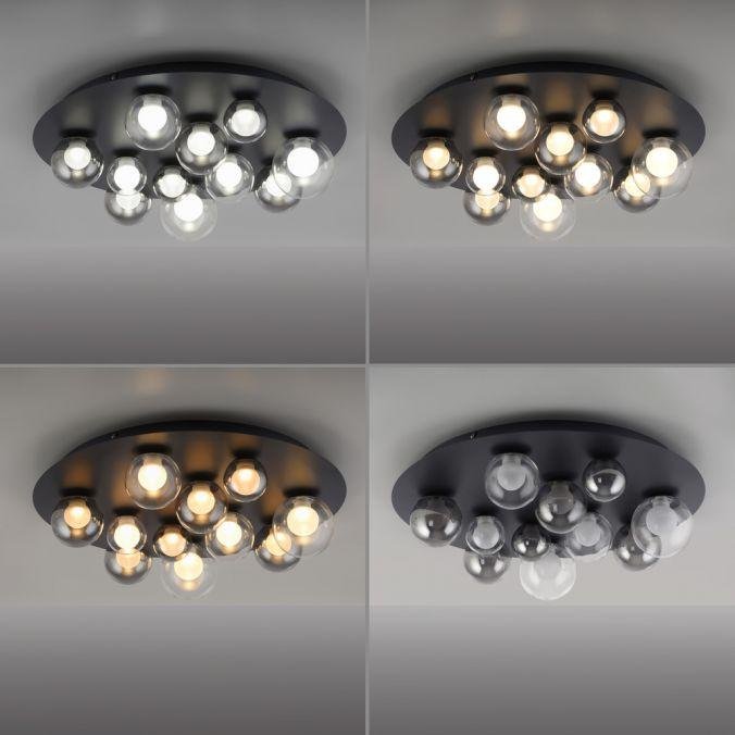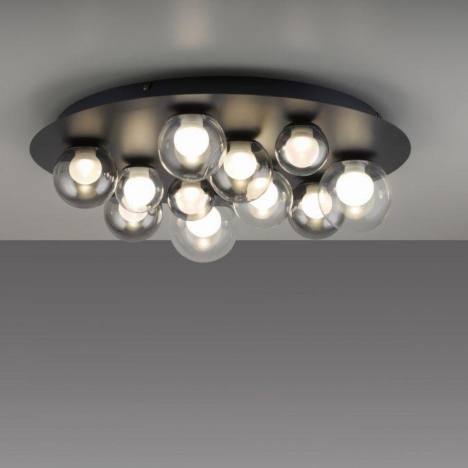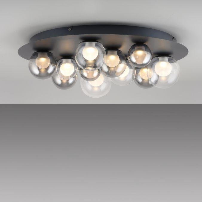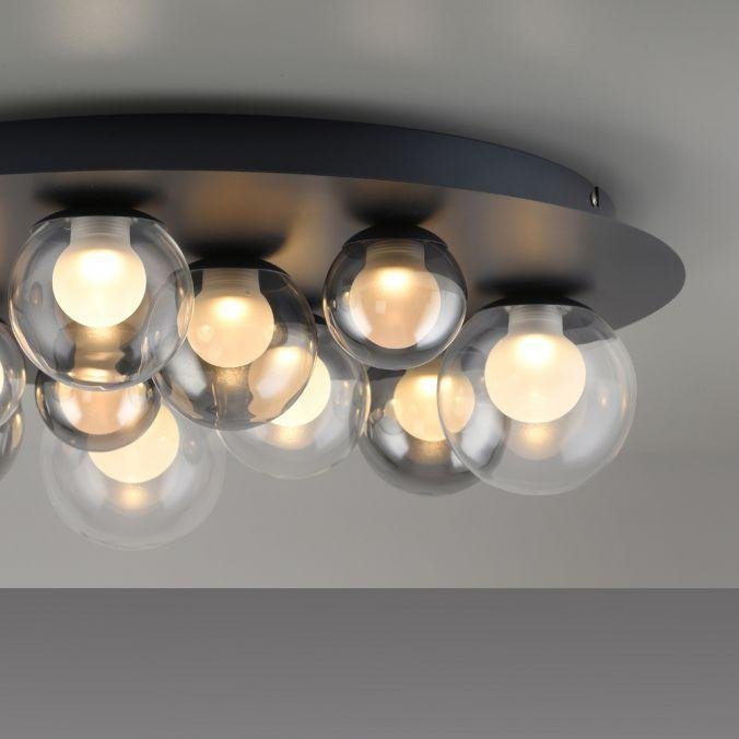 Dominantní kruhová základna v mysticky šedé barvě nese jedenáct skleněných koulí v čirém a kouřovém provedení, rozmístěných v různých velikostech. Výsledkem je výrazný plastický efekt a harmonický dojem, který v interiéru působí jako světelný objekt s dekorativní hodnotou. Sklo jako hlavní materiál podtrhuje kvalitní zpracování a zajišťuje příjemné rozptýlení světla.