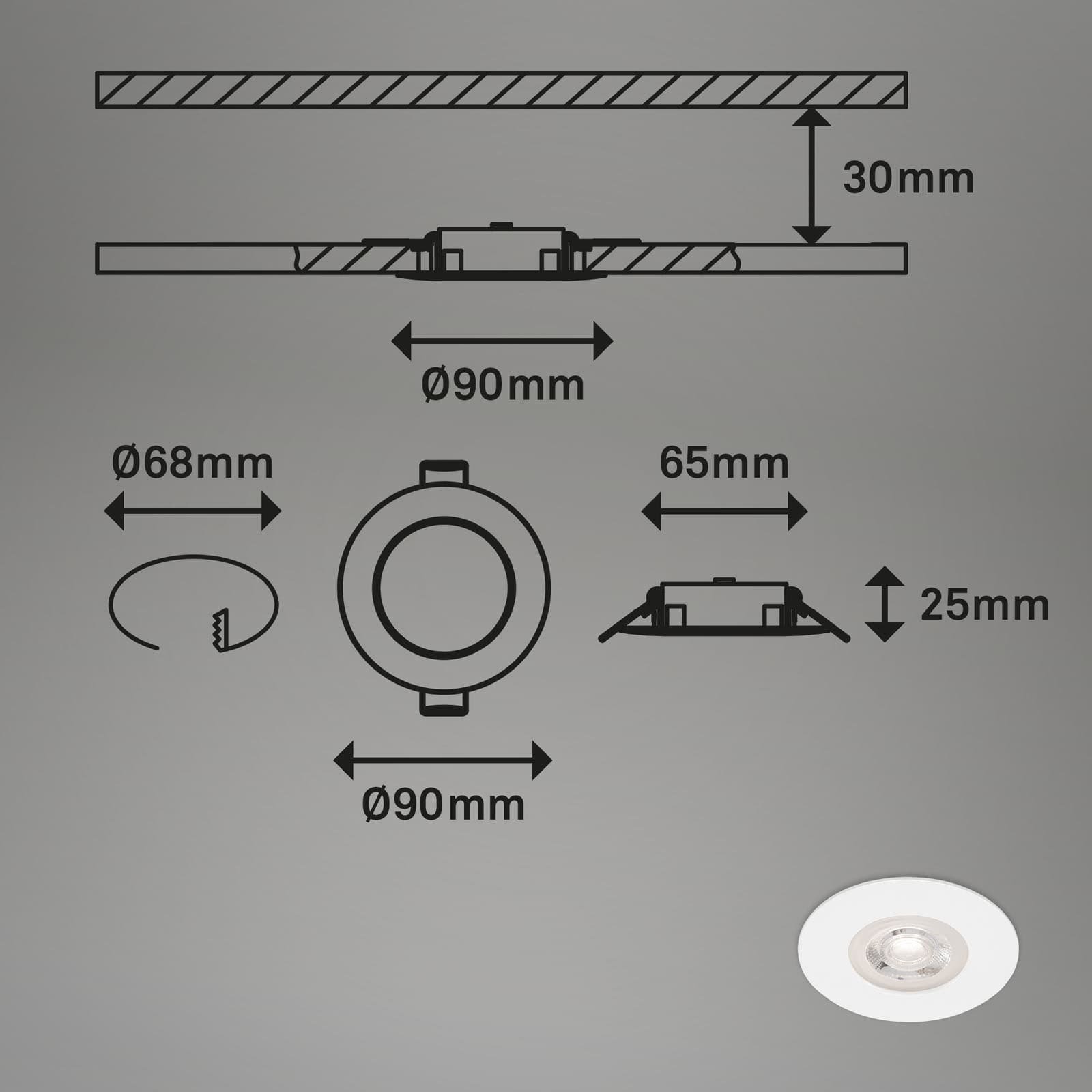 - Montážní otvor: Ø 68 mm, hloubka 30 mm