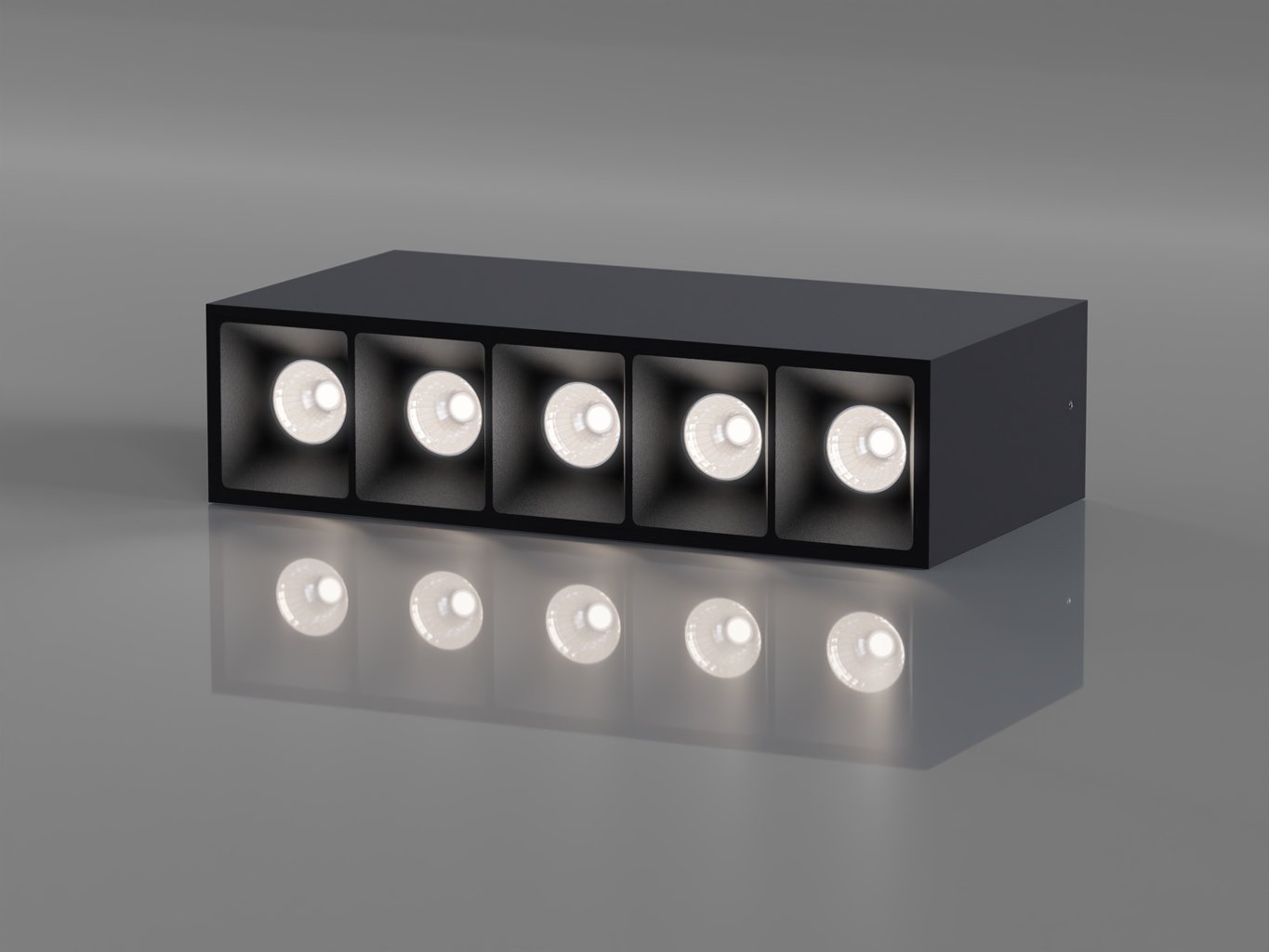 Svítidlo má hranatý, úzký tvar s pěti samostatnými optickými segmenty. Tělo je vyrobeno z hliníku v černé barvě (RAL 9005), reflektory jsou z polykarbonátu. Minimalistické provedení podporuje začlenění do moderních i technických interiérů.
