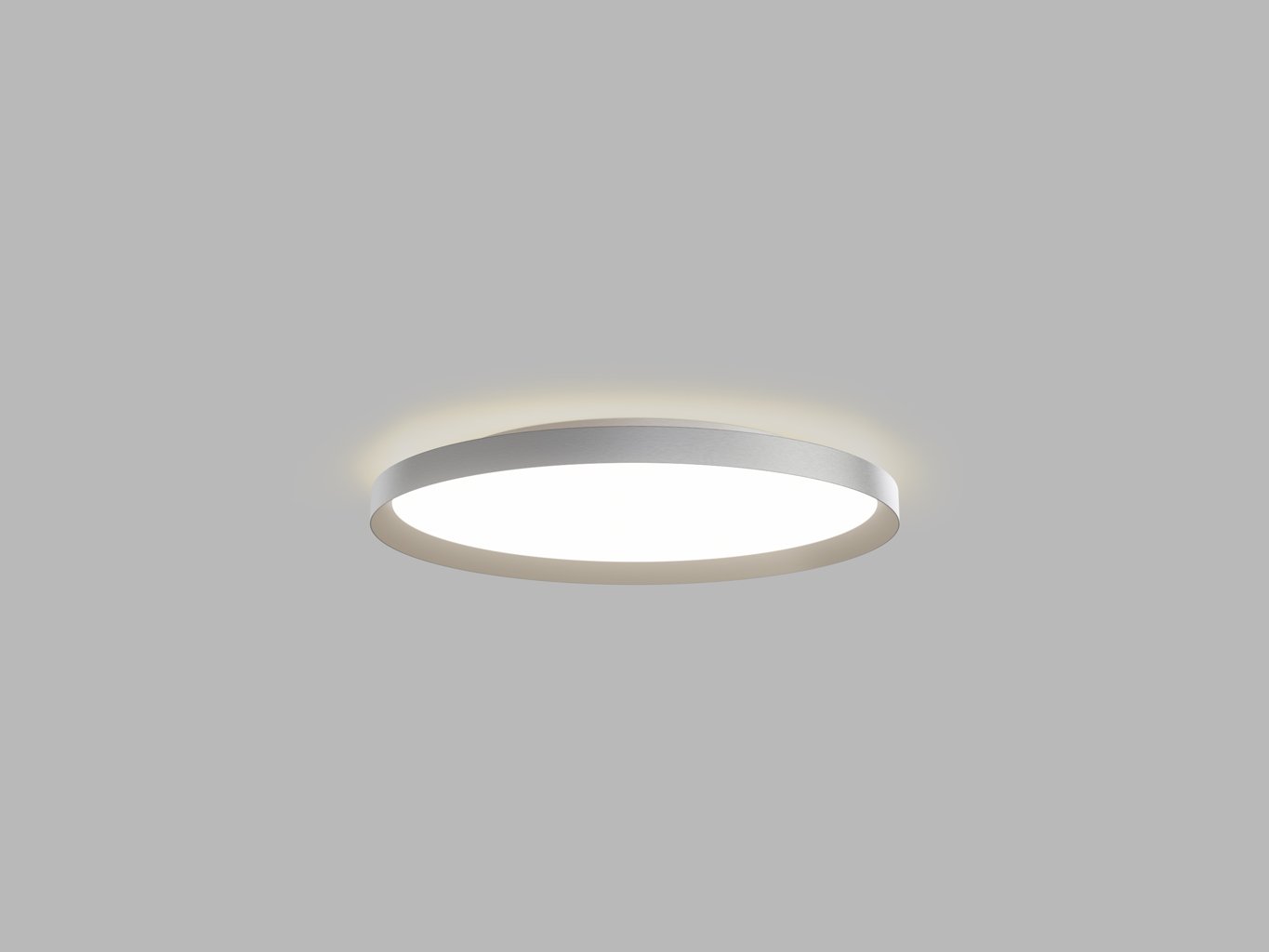 Tělo svítidla je z kovu v niklovém provedení (RAL 7032), doplněné opálovým PMMA difuzorem, který eliminuje oslnění a zajišťuje homogenní rozptyl světla. Výška 70 mm a průměr 600 mm podtrhují subtilní, ale výrazný vzhled v prostoru. Povrchová úprava matný nikl působí neutrálně a snadno navazuje na další kovové prvky v interiéru.