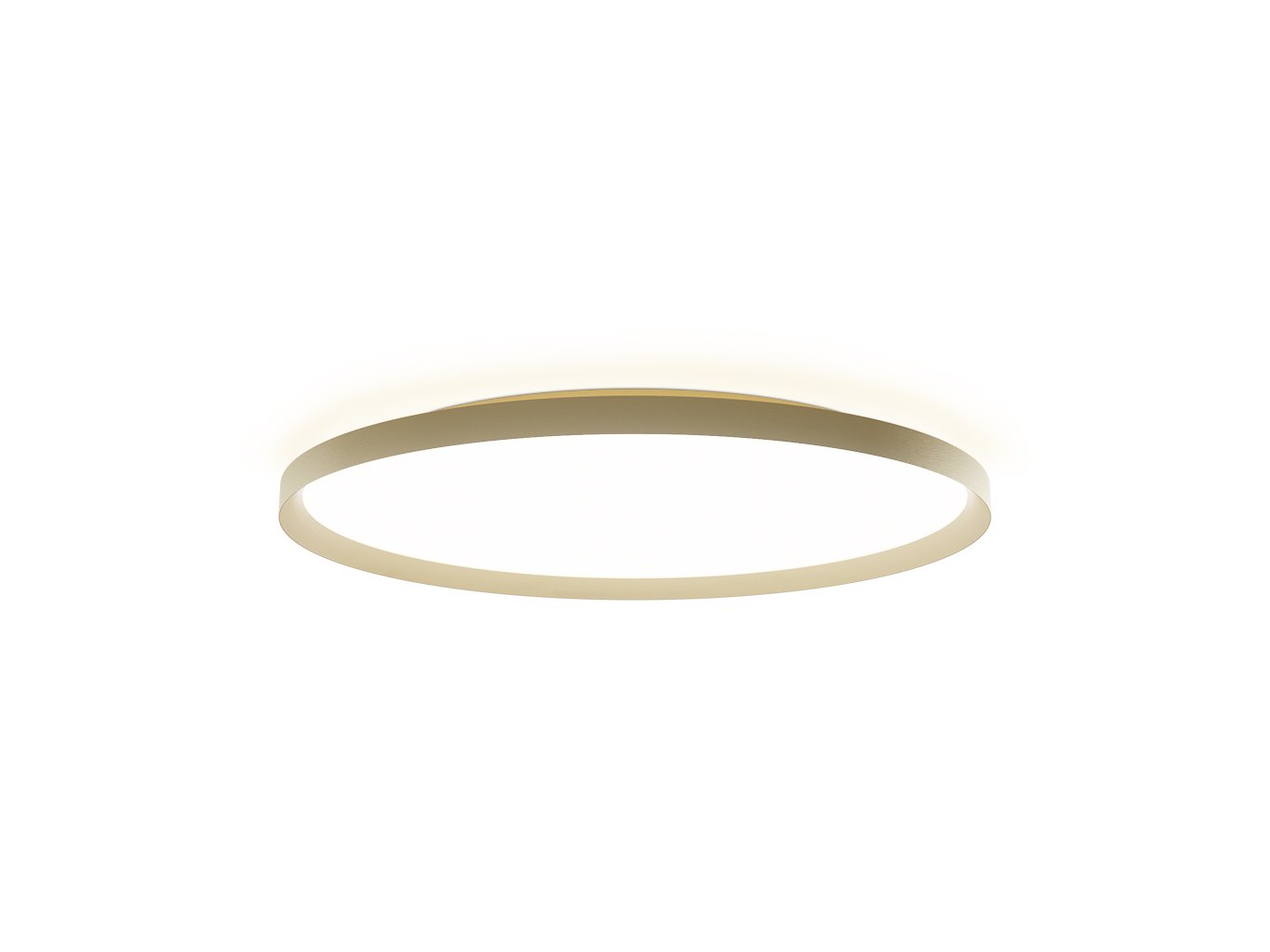 Tělo svítidla tvoří kov v povrchové úpravě zlaté barvy (RAL 1036), doplněný opálovým difuzorem z PMMA. Kruhový tvar o průměru 800 mm a výšce 70 mm podtrhuje čistý a elegantní vzhled, který v interiéru působí jako dominantní světelný prvek. Konstrukce umožňuje přímé i nepřímé vyzařování, což podporuje vizuální komfort a měkké rozptýlení světla.