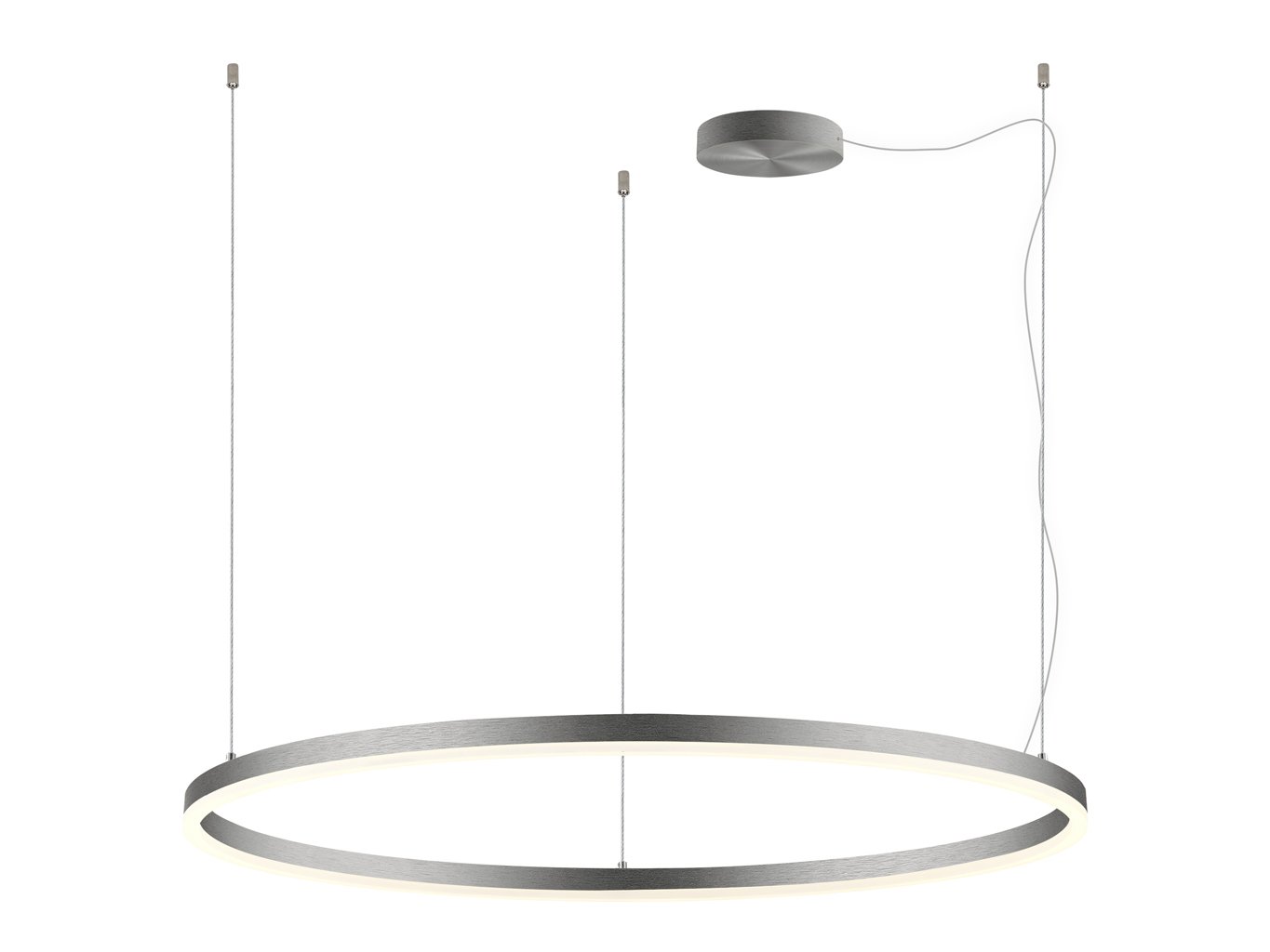 Konstrukce svítidla je založena na subtilním hliníkovém kruhu o průměru 1000 mm, povrchově upraveném v matném niklu (RAL 7032). Světelný difuzor z opálového PMMA zajišťuje rovnoměrné rozptýlení světla po celém obvodu. Minimalistické zavěšení na lankách podtrhuje současný charakter svítidla a umožňuje jeho instalaci v různých výškách až do 5 metrů.