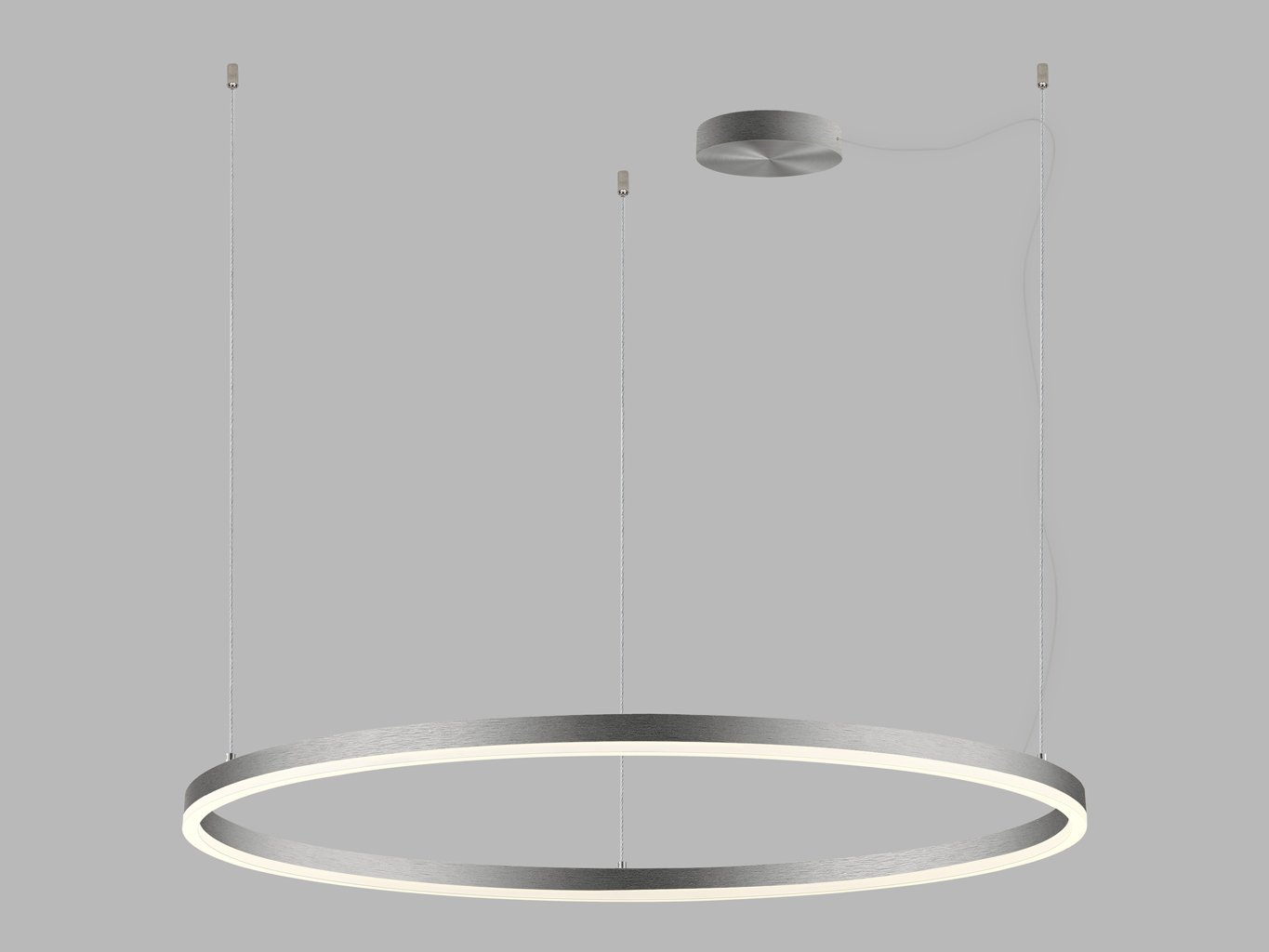 Kruhový tvar svítidla s průměrem 1000 mm a výškou zavěšení až 5000 mm podtrhuje minimalistický a současně elegantní charakter. Tělo je vyrobeno z hliníku v matném niklovém provedení (RAL 7032), což zajišťuje nejen vizuální čistotu, ale i dlouhodobou odolnost. Opálový difuzor z PMMA eliminuje oslnění a podporuje rovnoměrné rozložení světla v prostoru.