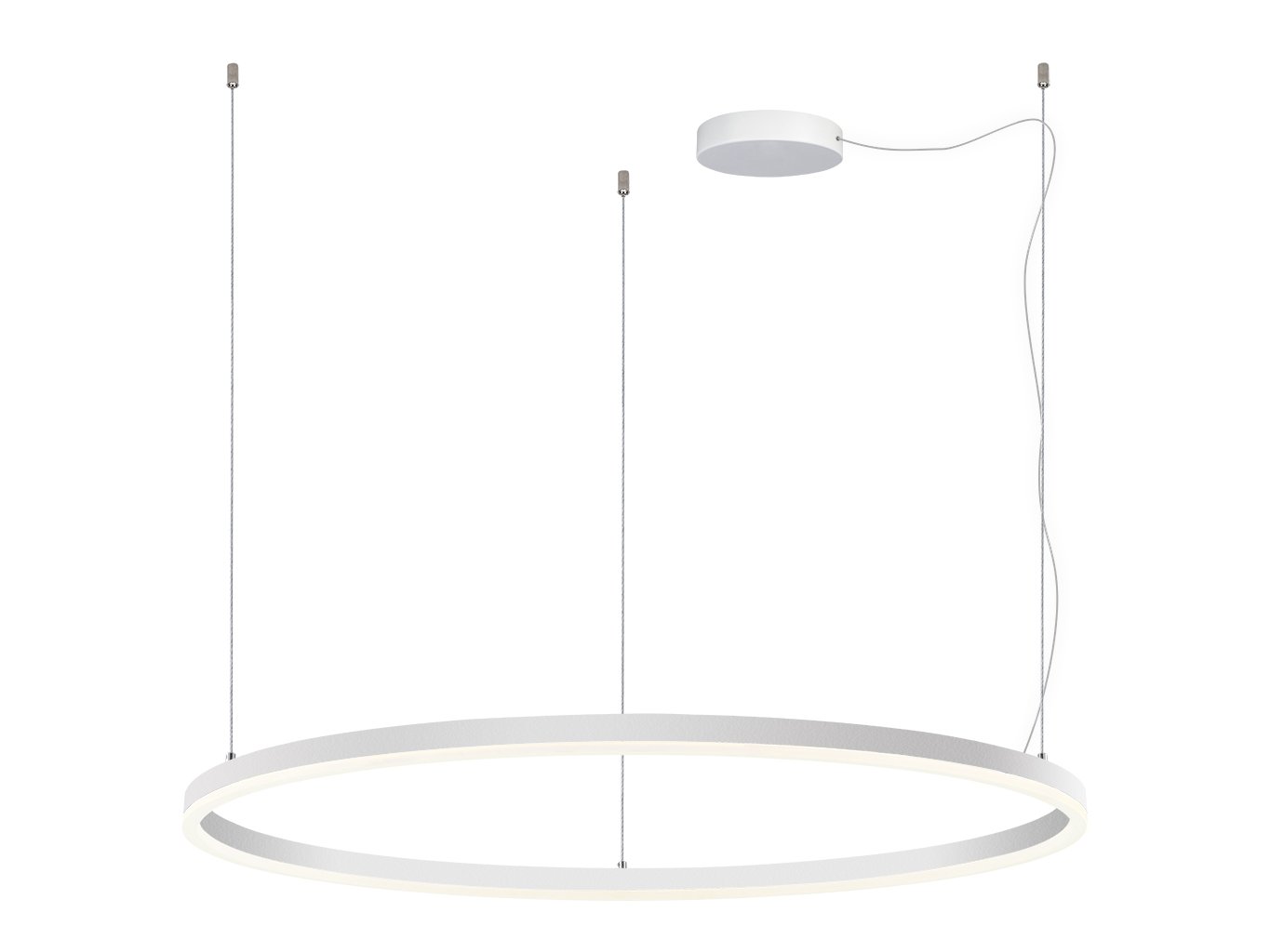 Konstrukce svítidla je tvořena hliníkovým profilem v bílé barvě (RAL 9003), doplněným opálovým difuzorem z PMMA pro zajištění homogenního rozptylu světla. Průměr svítidla je 1000 mm, výška zavěšení až 5000 mm. Minimalistické provedení zdůrazňuje subtilní tvar a vizuální lehkost v prostoru.