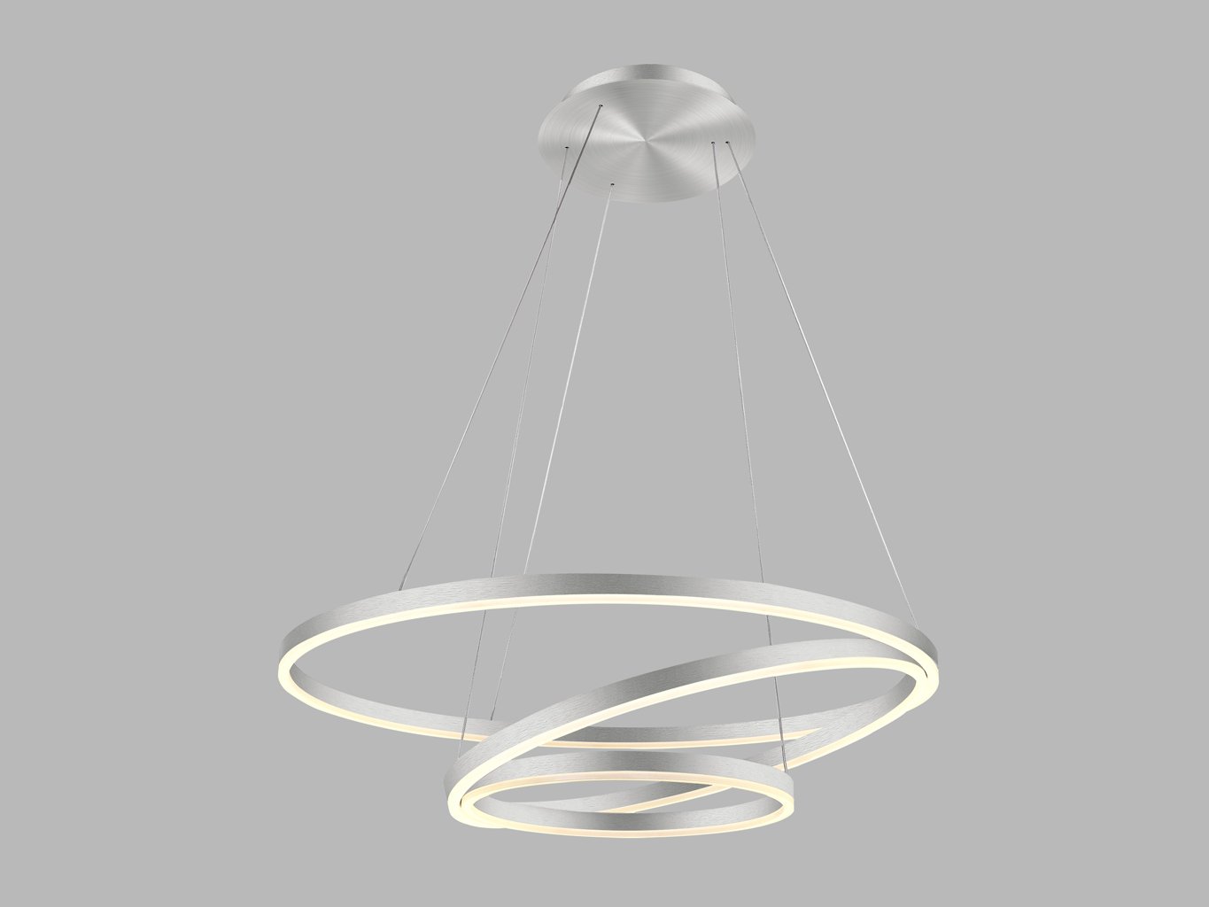 Dominantní prvek tvoří tři kruhové prstence zavěšené na subtilních lankách, které vytvářejí dynamickou a současně elegantní kompozici. Svítidlo je vyrobeno z hliníku v matném niklovém provedení (RAL 7032), opálový difuzor z PMMA zajišťuje rovnoměrné rozptýlení světla. Celkový průměr sestavy činí 800 mm, výška zavěšení až 5000 mm umožňuje flexibilní instalaci v různě vysokých místnostech.