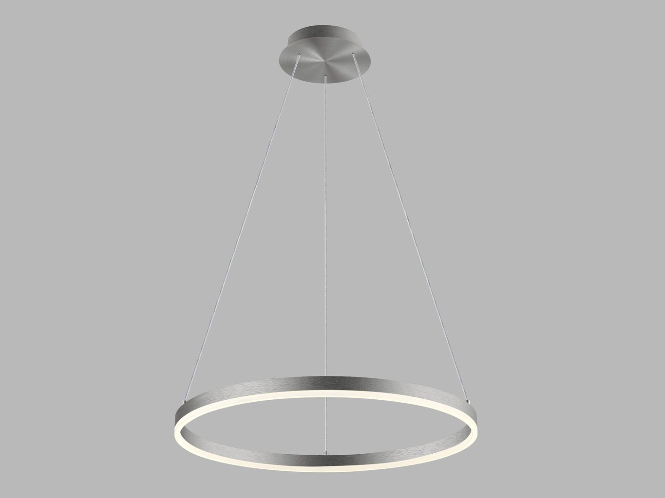 Konstrukce svítidla je tvořena hliníkovým profilem v matném niklovém provedení (RAL 7032), který vytváří elegantní kruh o průměru 600 mm. Světelný difuzor z opálového PMMA zajišťuje rovnoměrné rozptýlení světla po celém obvodu. Minimalistický vzhled podtrhuje subtilní zavěšení na třech lankách s decentním stropním baldachýnem.