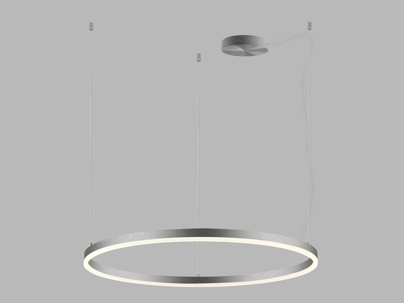 Dominantou svítidla je subtilní kruhový tvar s průměrem 800 mm, vyrobený z hliníku v matném niklovém provedení (RAL 7032). Světelný difuzor z opálového PMMA zajišťuje homogenní rozptyl světla po celém obvodu. Konstrukce je navržena pro zavěšení na lankový systém s maximální délkou 5 metrů, což umožňuje variabilní umístění v prostoru.