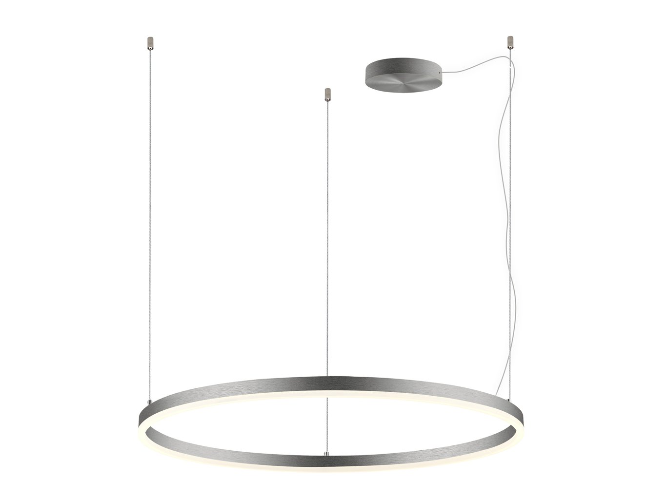 Konstrukce svítidla vychází z jednoduchého kruhového tvaru s průměrem 800 mm. Tělo je vyrobeno z hliníku v matném niklovém provedení (RAL 7032), difuzor je z opálového PMMA, což zajišťuje rovnoměrné rozptýlení světla bez viditelných bodových zdrojů. Minimalistické zavěšení na lankách podtrhuje subtilní charakter svítidla a umožňuje jeho instalaci i do prostor s vyšším stropem.