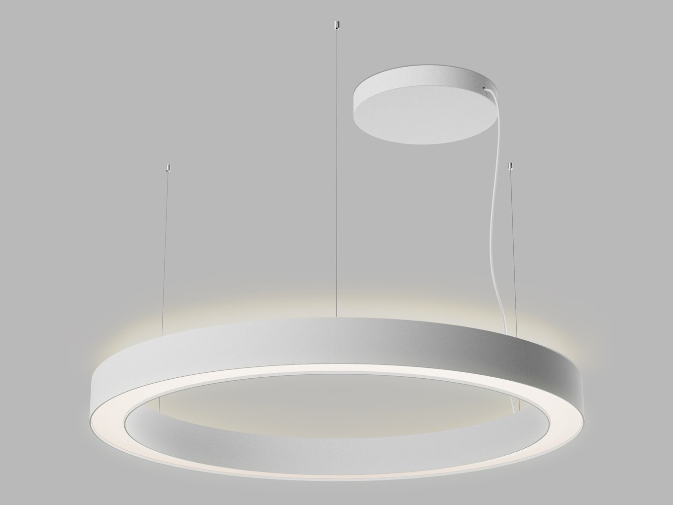 Tělo svítidla tvoří precizně zpracovaný hliníkový prstenec v bílé barvě (RAL 9003), doplněný o prizmatický difuzor z PMMA. Průměr svítidla je 1000 mm při výšce 85 mm, zavěšení umožňuje délku až 5 metrů. Minimalistický tvar a čisté linie podtrhují architektonický charakter svítidla, které v prostoru působí jako dominantní světelný prvek bez vizuálního rušení.