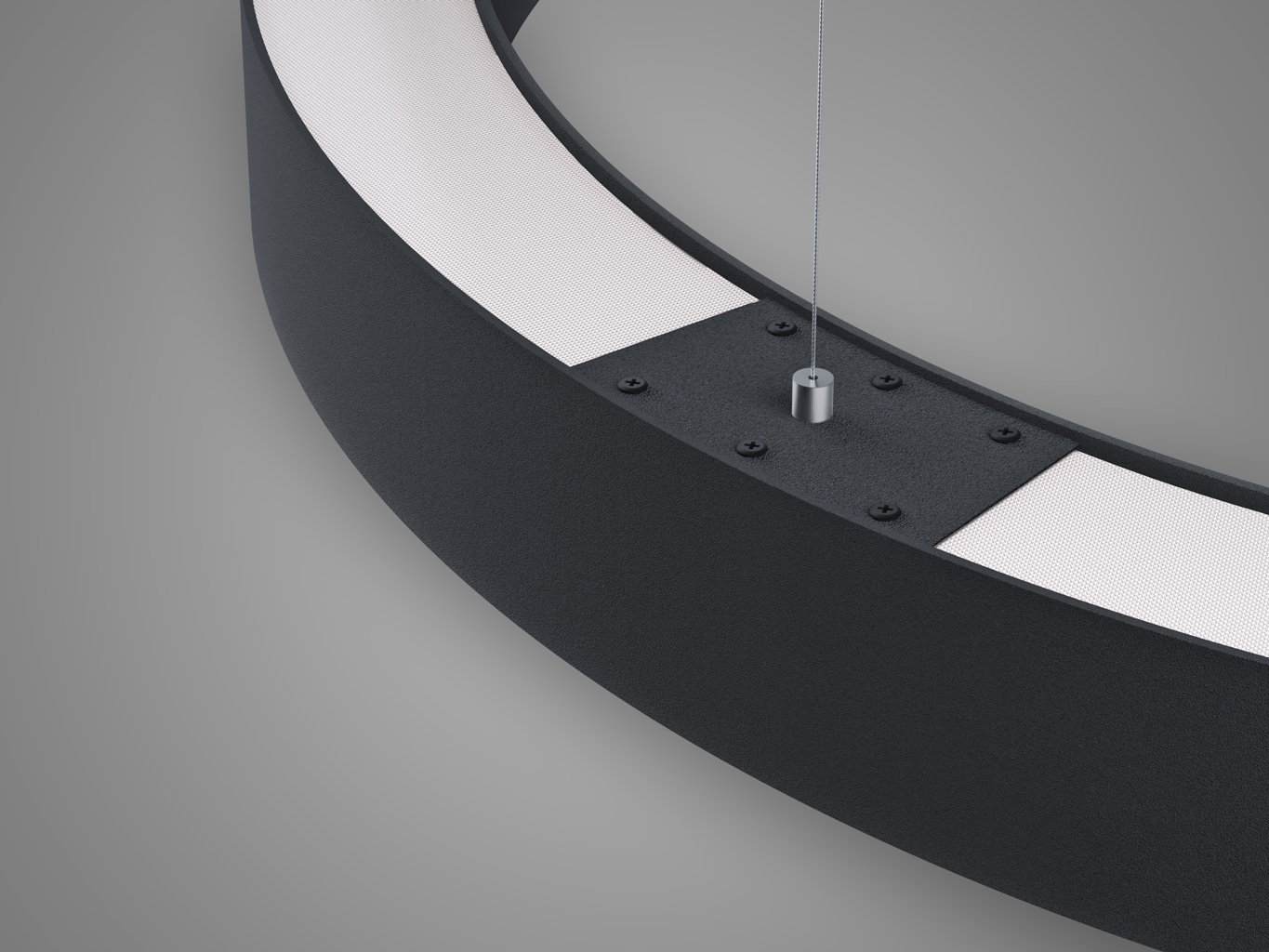 Konstrukce svítidla vychází z tvaru štíhlého prstence o průměru 600 mm, zavěšeného na tenkých lankách. Tělo je vyrobeno z hliníku v matné černé barvě (RAL 9017), což podtrhuje jeho současný technický charakter. Prizmatický difuzor z PMMA zajišťuje rovnoměrné rozptýlení světla a eliminuje oslnění. Výška svítidla je 85 mm, délka závěsu až 5 metrů umožňuje variabilní instalaci podle výšky stropu.