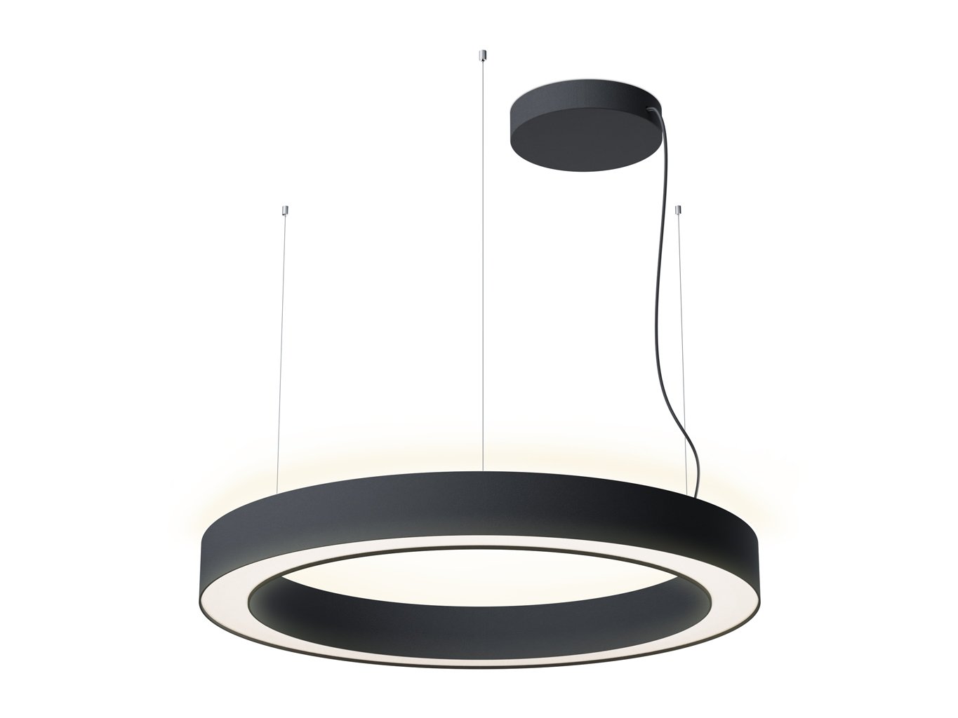 Tělo svítidla tvoří subtilní hliníkový prstenec v černé barvě (RAL 9017), doplněný prizmatickým difuzorem z PMMA, který zajišťuje rovnoměrné rozptýlení světla a omezuje oslnění. Minimalistický tvar a precizní konstrukce umožňují začlenění do reprezentativních i funkčních interiérů. Průměr svítidla je 800 mm, výška 85 mm, délka závěsu až 5 metrů.
