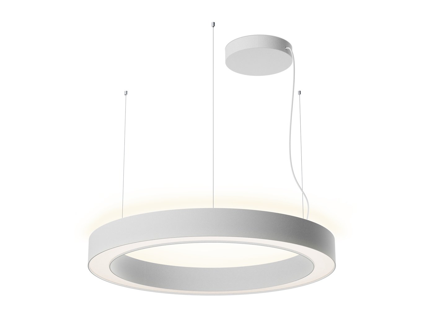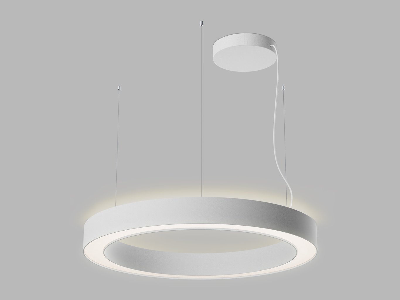 Konstrukce svítidla je tvořena hliníkovým prstencem s průměrem 800 mm a výškou 85 mm, povrchová úprava je v bílé barvě dle RAL 9003. Prizmatický difuzor z PMMA zajišťuje rovnoměrné rozptýlení světla a eliminuje oslnění. Minimalistický tvar a subtilní zavěšení na lankách podporují čistý architektonický výraz svítidla v prostoru.