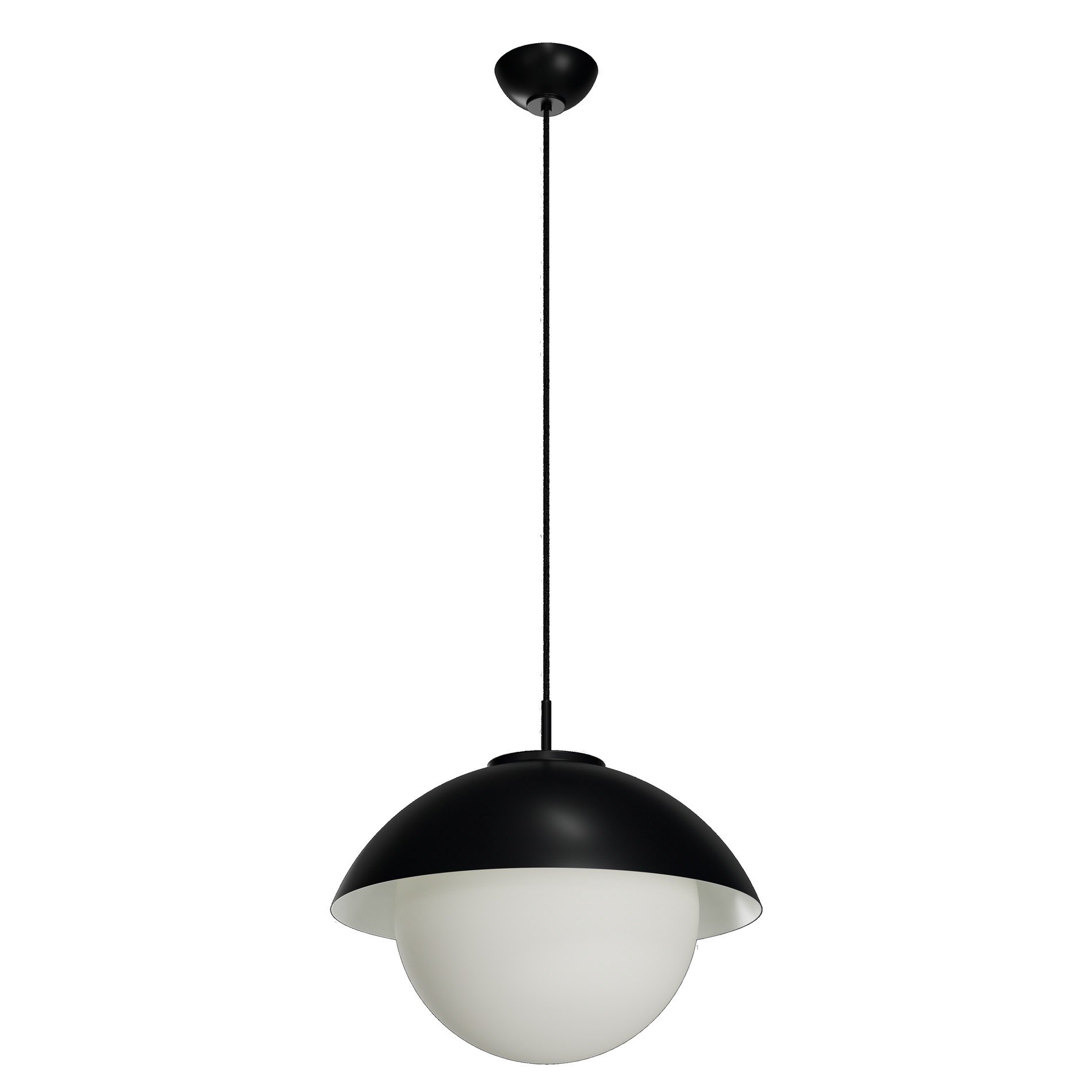 Černé závěsné LED svítidlo ON/OFF s dekorativním límcem a skleněné stínidlo TRIPLEX OPAL. Textilní kabelový závěs s vnitřním nosným lankem o délce 100 cm.