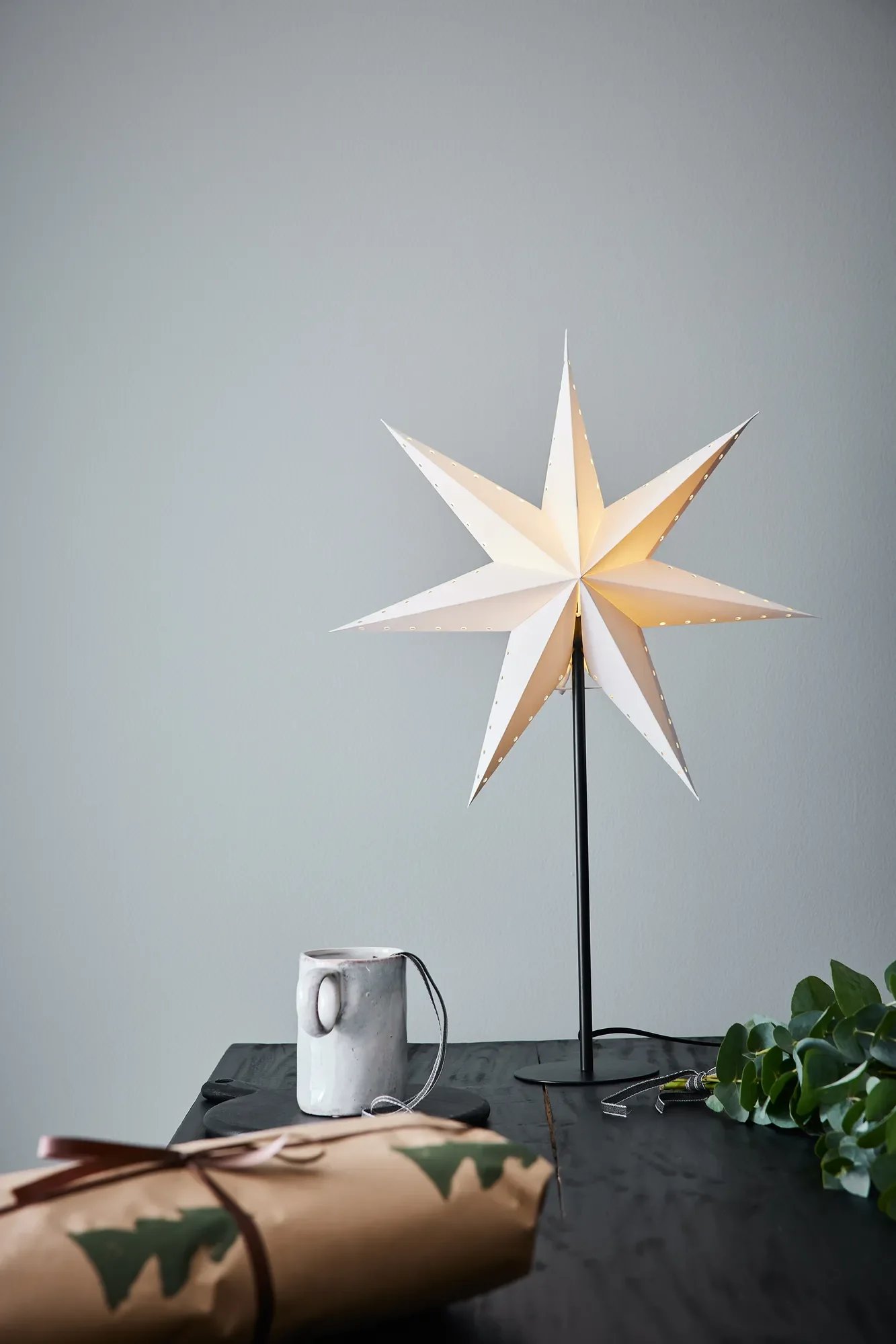 Dopřejte svému domovu stylovou atmosféru s originální stolní hvězdou Lively od švédské značky Markslöjd. Tato designová svítící dekorace vyniká čistými liniemi, elegantní bílou papírovou hvězdou o průměru 45 cm a kontrastní černou kovovou základnou. Precizní perforace na okrajích umožňuje jemné prostupování světla, které navodí příjemné vánoční i zimní nálady.