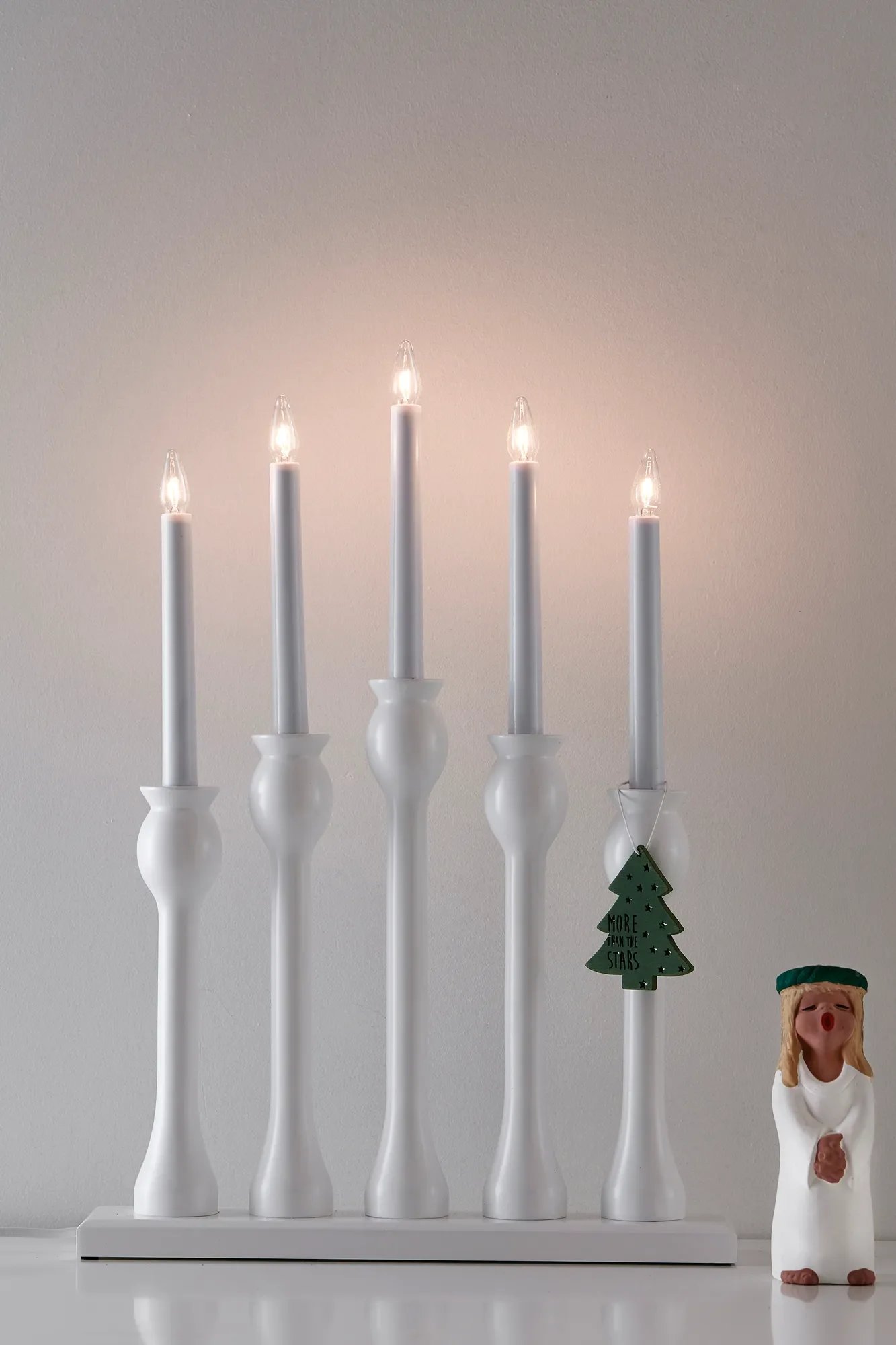 - Pět světelných zdrojů: Svícen je osazen pěti žárovkami (patice E10, součástí balení), které vytvářejí hřejivou atmosféru zejména v okně či na komodě.
