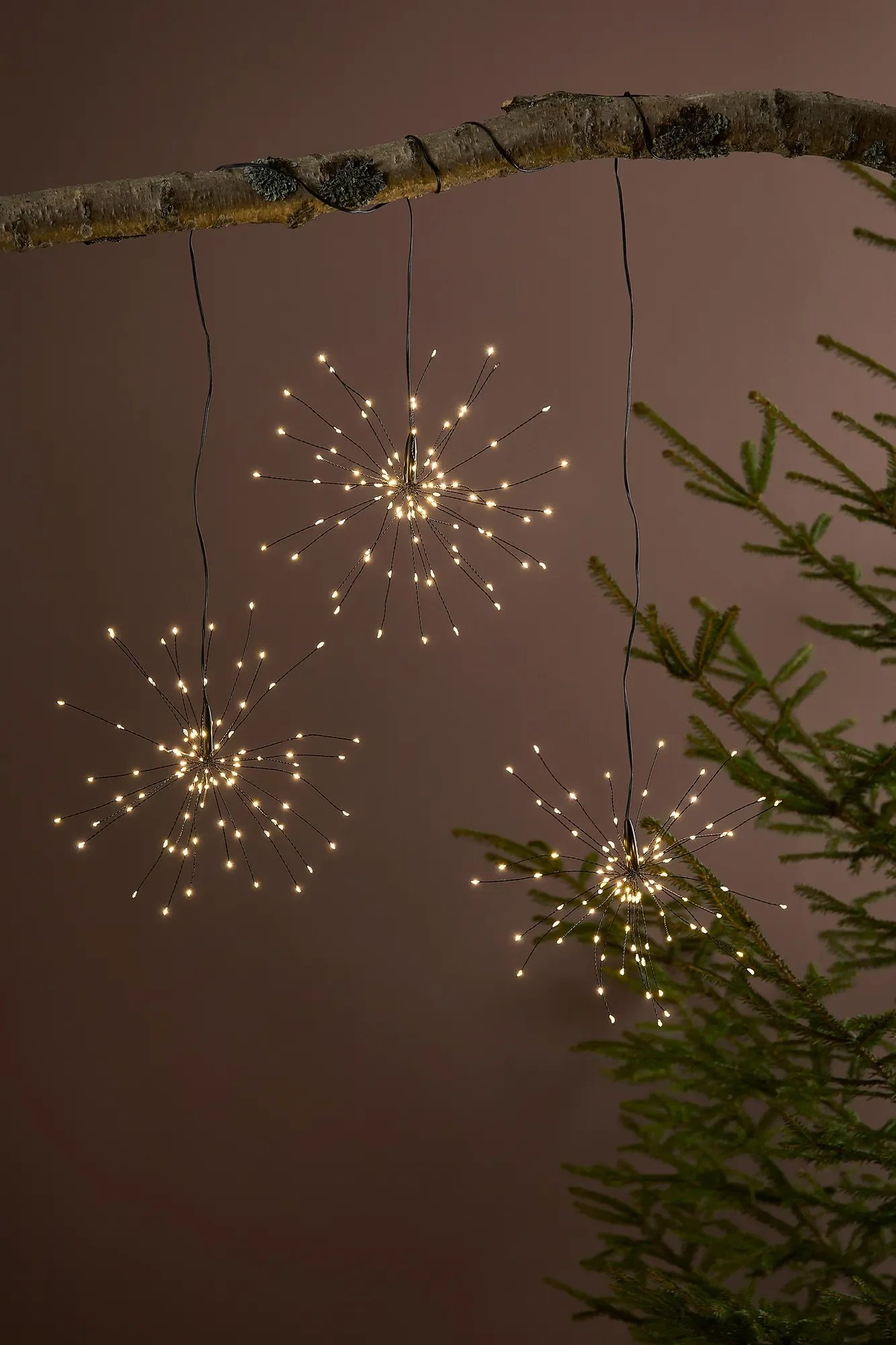 Meteor od renomované značky Markslöjd je působivá závěsná dekorace, která povznese atmosféru vaší terasy, zahrady či vstupního prostoru. Tři efektní závěsy o průměru 25 cm vytváří s celkem 270 LED diodami magický světelný efekt připomínající padající hvězdy nebo rozkvět ohňostroje. Mezi jednotlivými dekoracemi je rozestup 2 metry, což zajišťuje rovnoměrné rozložení světla a dokonalý vizuální zážitek.