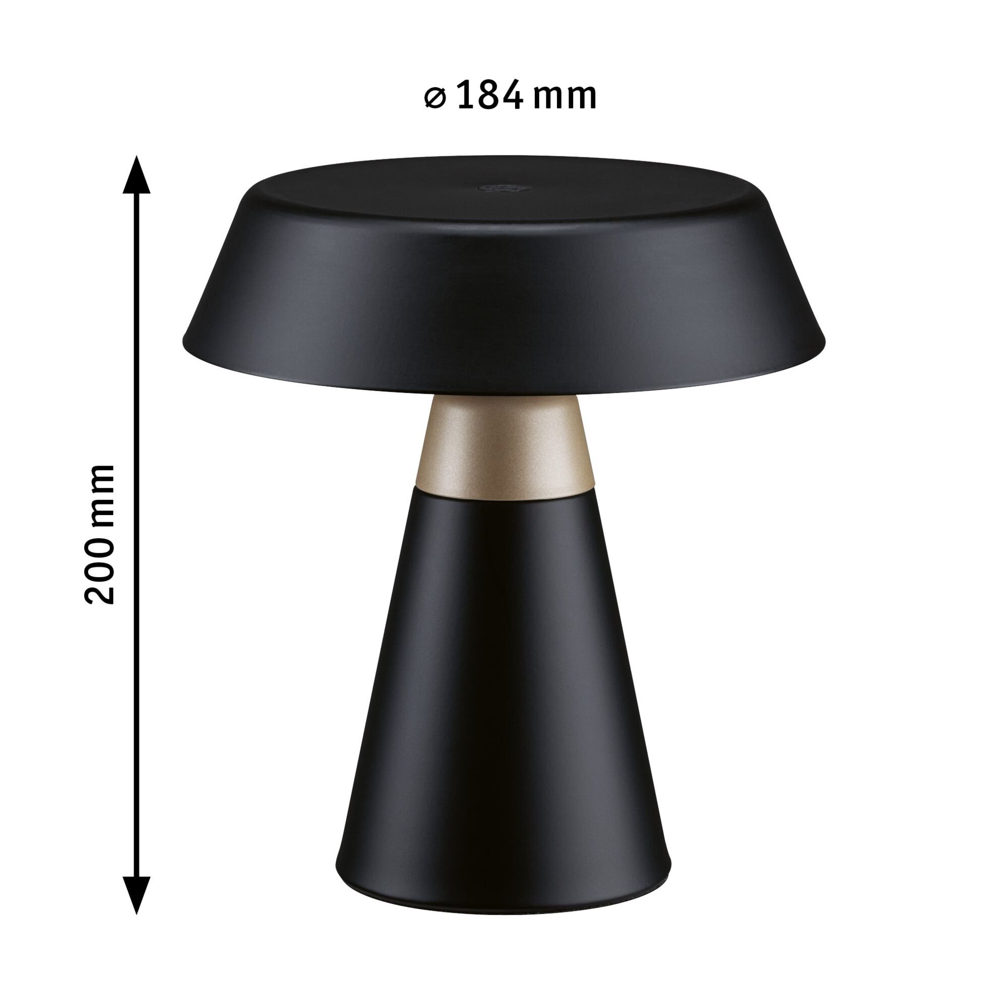 Svítidlo má kompaktní tvar s kulatým půdorysem, výšku 200 mm a průměr 184 mm. Kombinace černého kovu a šampaň plastového detailu vytváří moderní a decentní vzhled. Konstrukce je robustní, vhodná pro časté přenášení a použití na různých typech stolních ploch.