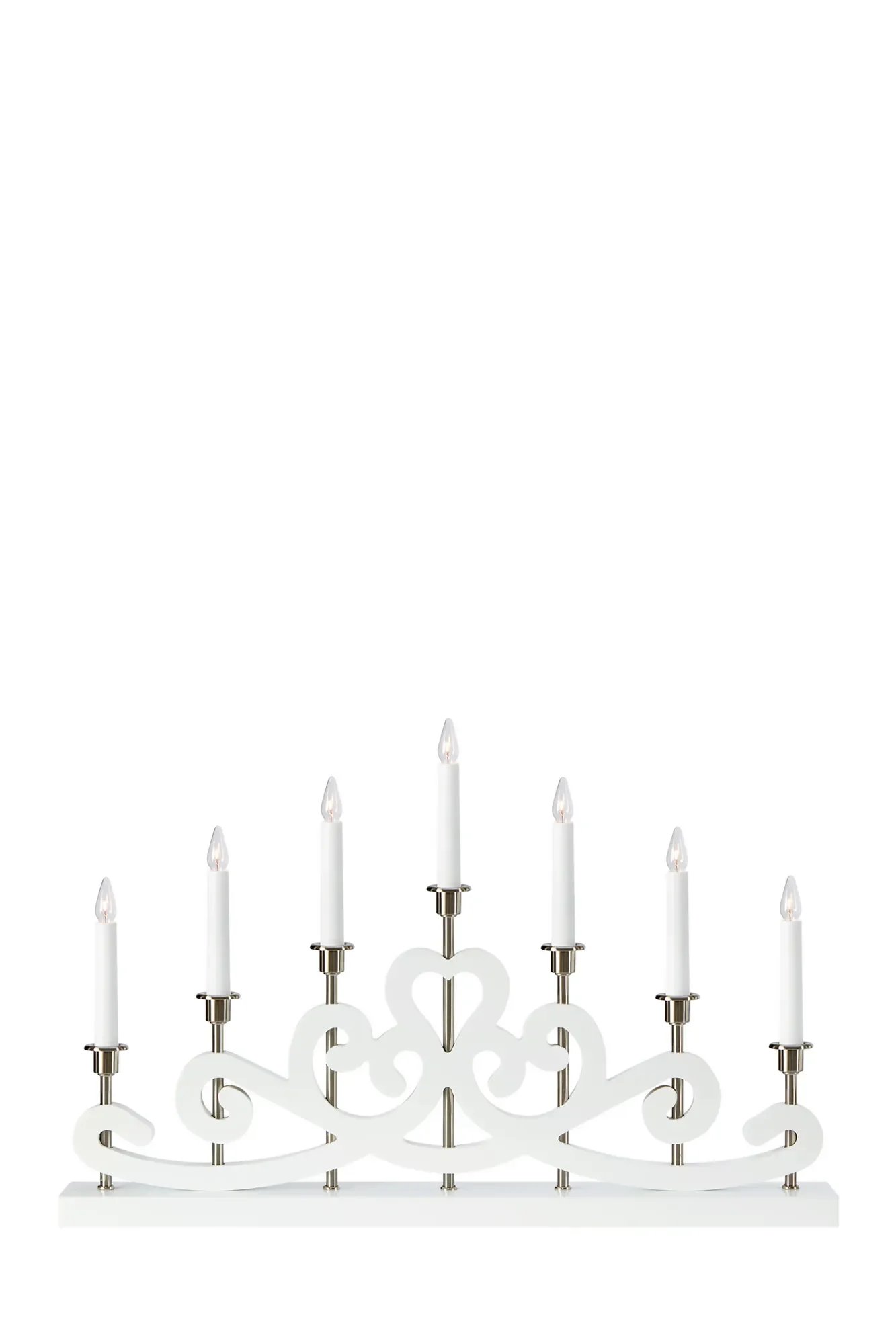 Nightfall bílý svícen od renomované značky Markslöjd představuje moderní interpretaci klasického adventního svícnu. Elegantní bílé provedení v kombinaci se stříbrnými detaily dodává interiéru punc luxusu a slavnostního kouzla. Jeho precizně zpracované linie a kvalitní materiály (MDF, železo) z něj činí ideální středobod slavnostní výzdoby, zejména v okně kuchyně, obývacího pokoje nebo recepce vašeho designového projektu.
