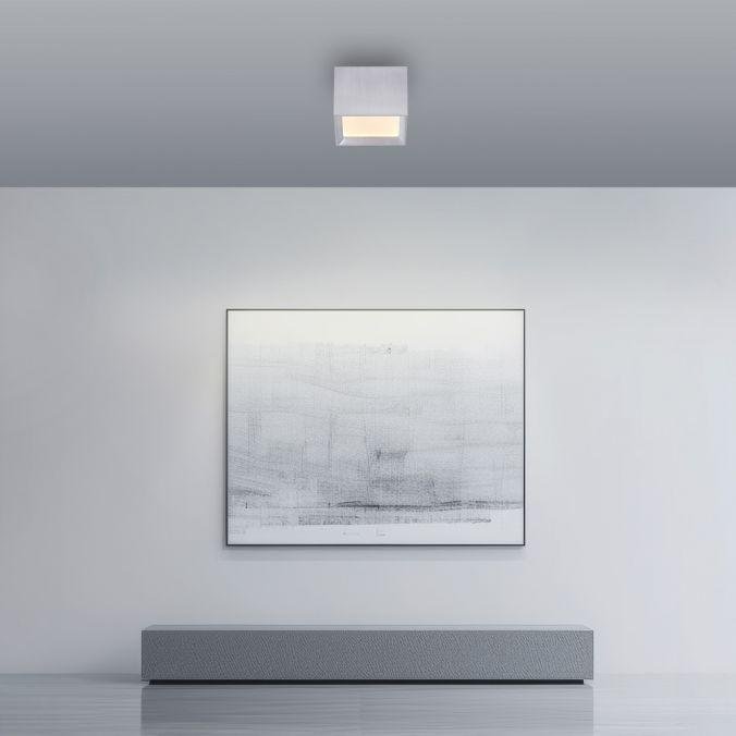 Svítidlo má výrazně geometrickou, čtvercovou formu s čistými liniemi. Povrch je proveden v šedé barvě s jemnou strukturou, která podtrhuje technický charakter hliníkového těla. Minimalistický design umožňuje začlenění do současných interiérů s důrazem na jednoduchost a funkčnost.