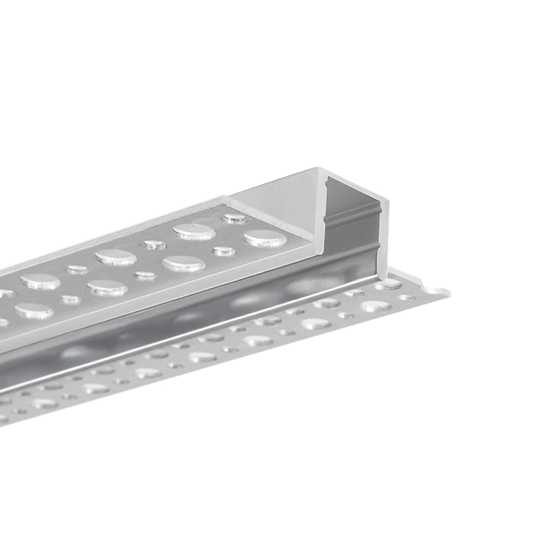 Profil je vyroben z anodizovaného hliníku v přírodní barvě, což zajišťuje odolnost vůči UV záření a dlouhodobou stabilitu povrchu. Konstrukce je přizpůsobena pro zapuštěnou instalaci do sádrokartonu, včetně perforovaných okrajů pro pevné napojení na okolní materiál. Součástí je ochranný kryt, který chrání LED pásek během montáže.