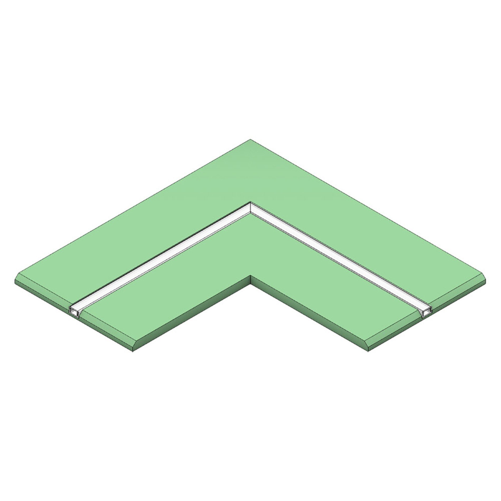 Profil tvoří kombinace sádrokartonové desky a hliníkového kanálu pro LED pásek. Rohové provedení umožňuje napojení dvou ploch v pravém úhlu, což je ideální pro řešení koutů nebo přechodů mezi stěnou a stropem. Povrch je připraven pro finální úpravu a sjednocení s okolní konstrukcí.