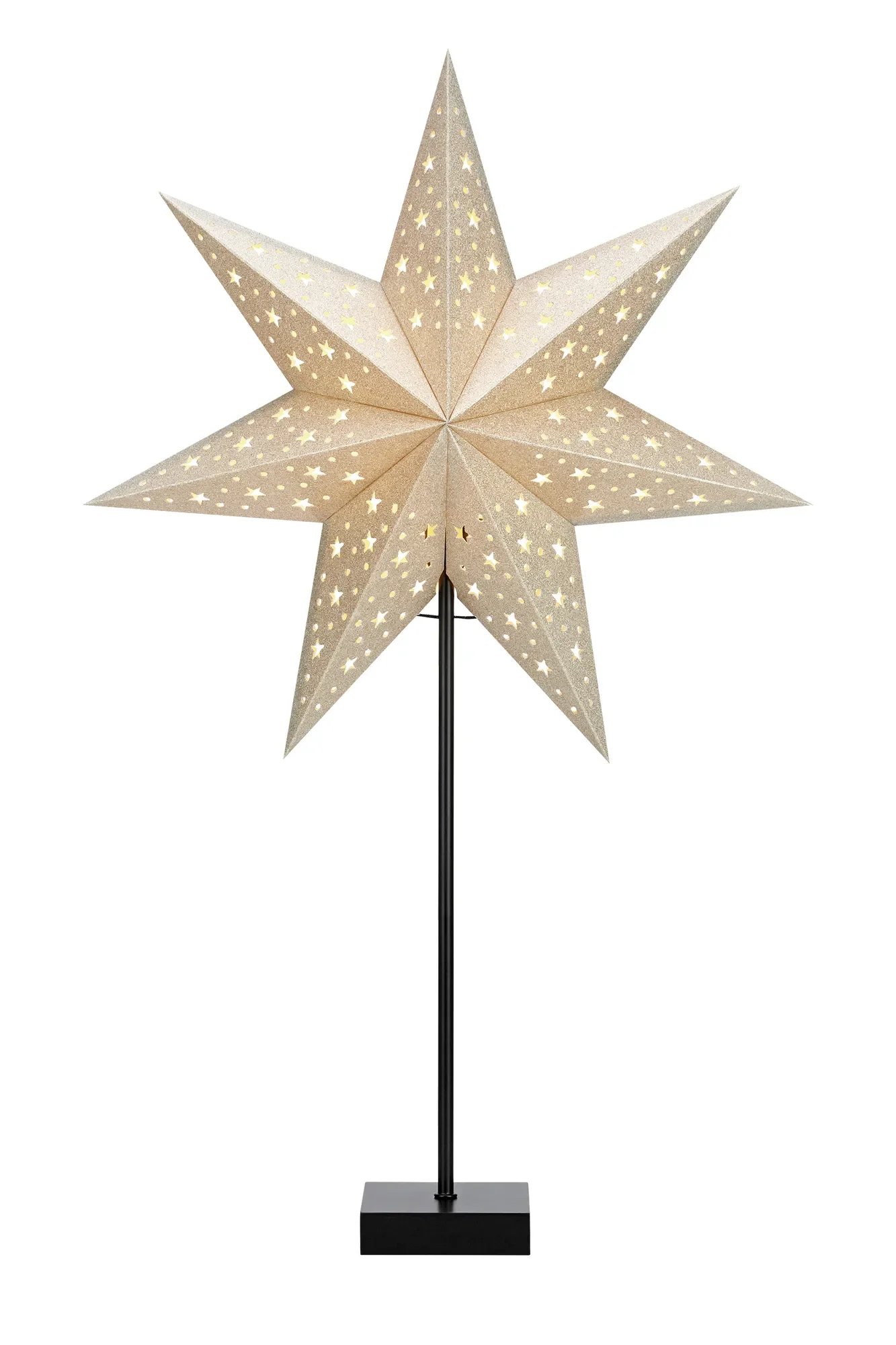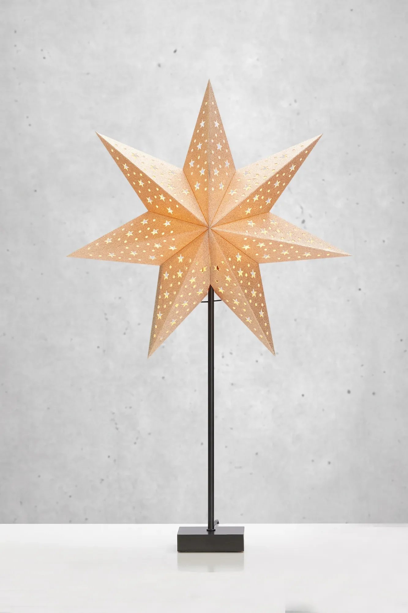 Solvalla zlatá hvězda na stůl od renomované značky Markslöjd je mistrovským spojením skandinávského minimalismu a tradiční vánoční symboliky. Svítidlo v podobě perforované papírové hvězdy na elegantním podstavci z borovicového dřeva a kovu přináší do interiéru teplé, slavnostní světlo a okamžitě navozuje pocit pohody a luxusu. Zlatý povrch v kombinaci s jemným dekorem hvězdiček podtrhuje exkluzivitu a prémiový charakter této dekorace.