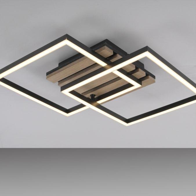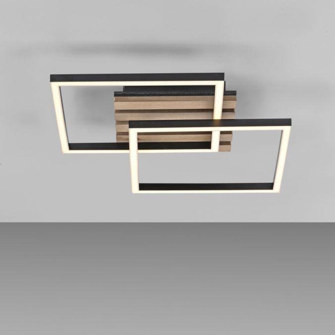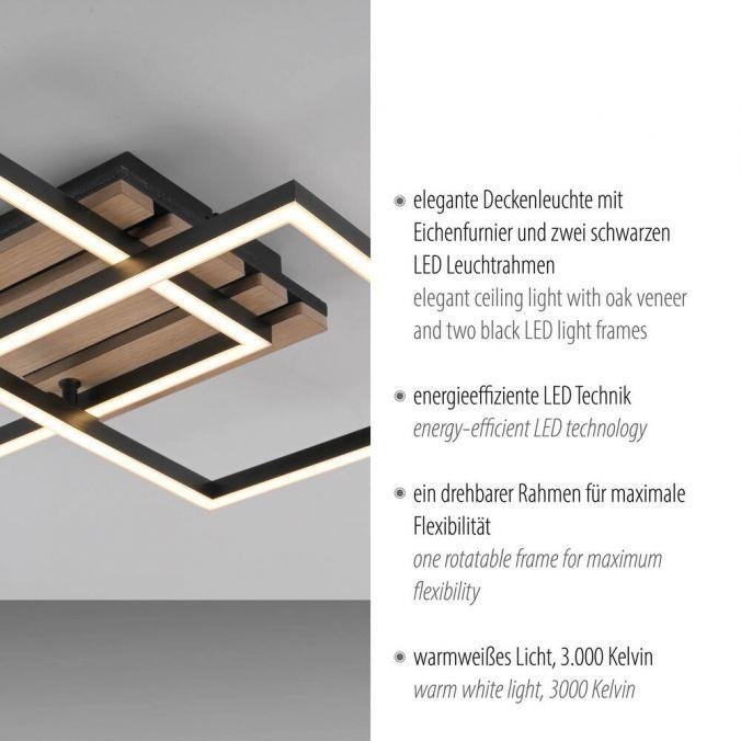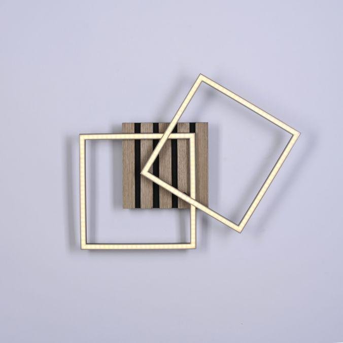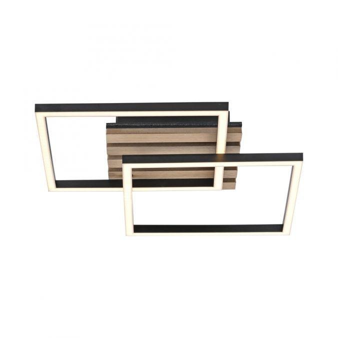 Dominantou svítidla jsou dva obdélníkové rámy v černé barvě s povrchovou úpravou z přírodního dřevěného dýhování. Středová část je tvořena akustickým panelem, který přispívá ke snížení hluku v prostoru. Kombinace černého kovu a dřeva vytváří elegantní kontrast a přirozený vzhled, který se hodí do moderních i přírodně laděných interiérů. Otočný rám umožňuje měnit kompozici svítidla podle potřeby.