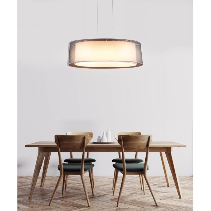 Závěsné svítidlo Theo má velmi ušlechtilý vzhled. Protože v jednom svítidle jsou dvě stínidla a to vytváří velmi zvláštní vzhled. Vnitřní stínítko je bílé a vnější stínítko je šedé a průsvitné.