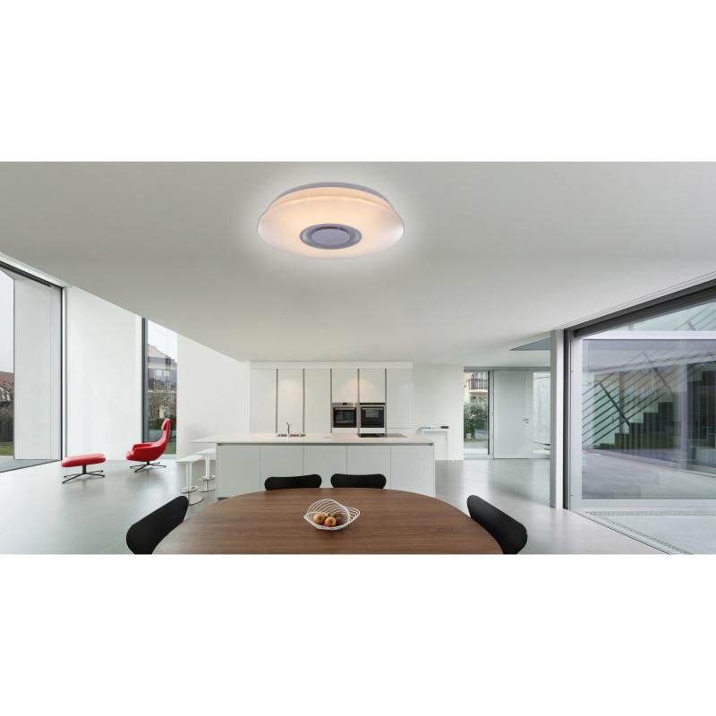 Moderní stropní svítidlo je ze série TUNE. 12W LED zdroj poskytuje 960 lumenů s barvou světla 3000 Kelvinů. Opálově akrylové stínítko je zkombinované s třpytivým dekorem. Toto stropní svítidlo má zabudovaný reproduktor. Jakékoliv zařízení můžete připojit přes Bluetooth a poslouchat své oblíbenou hudbu.