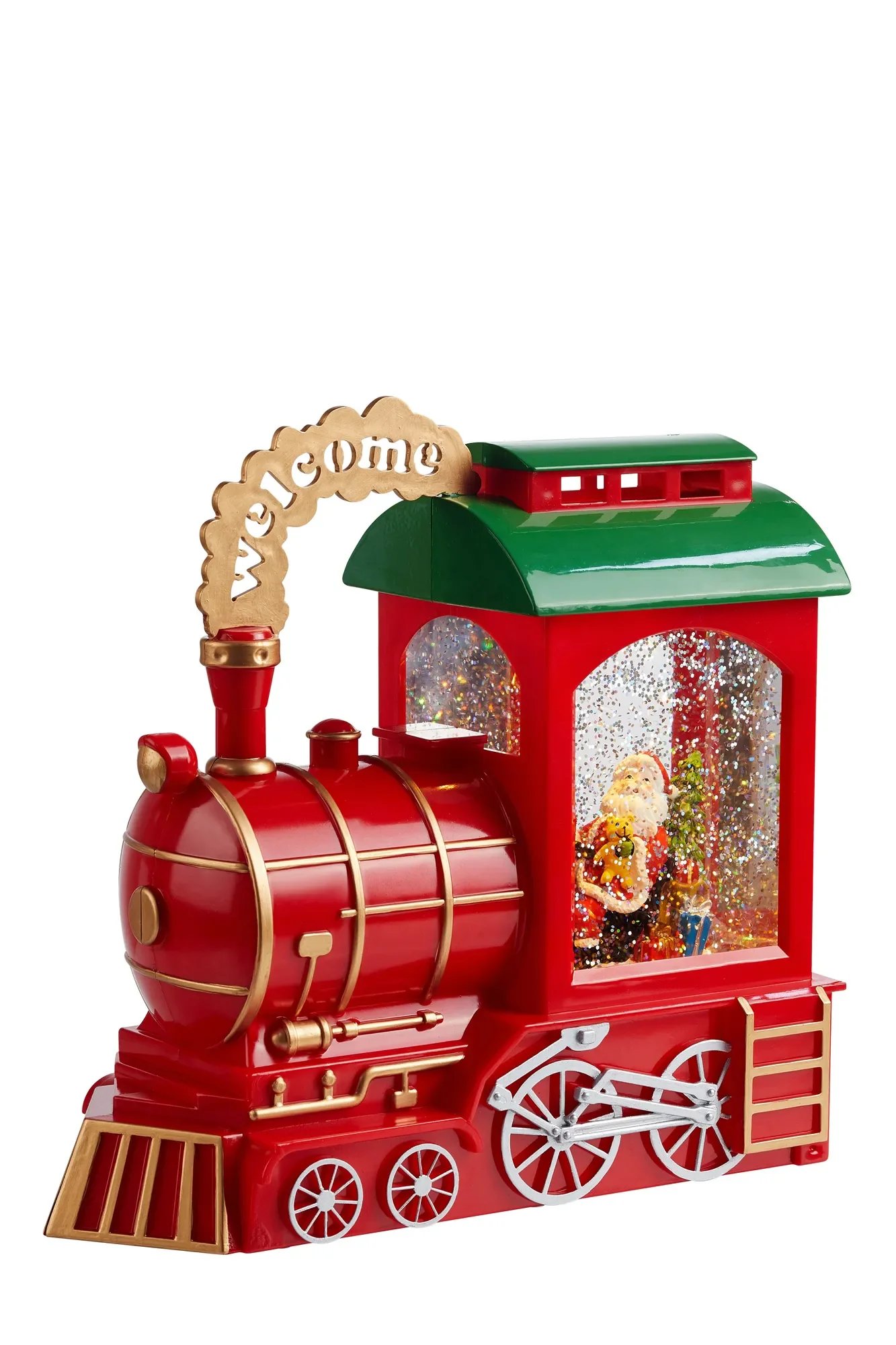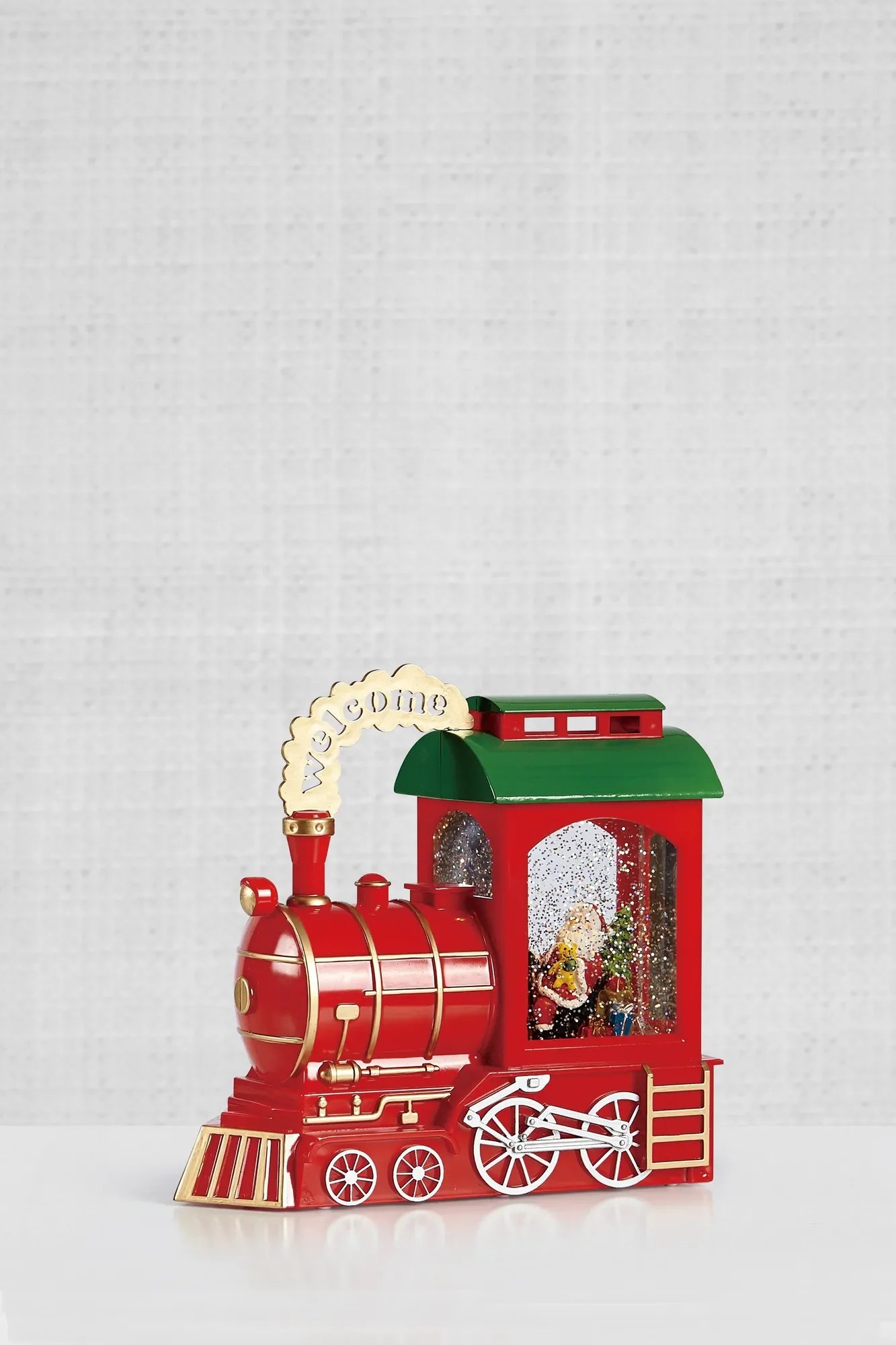 - Motiv: Santa v lokomotivě, vířící sníh, nápis „welcome“ ve zlatém oblaku dýmu