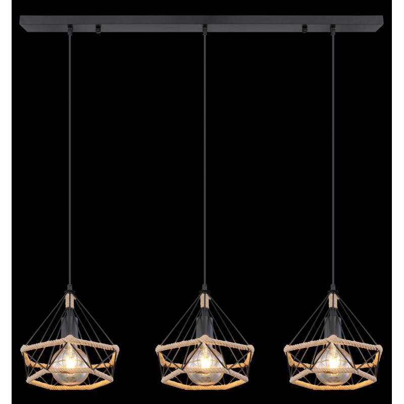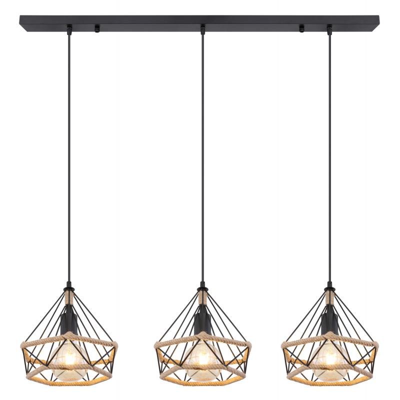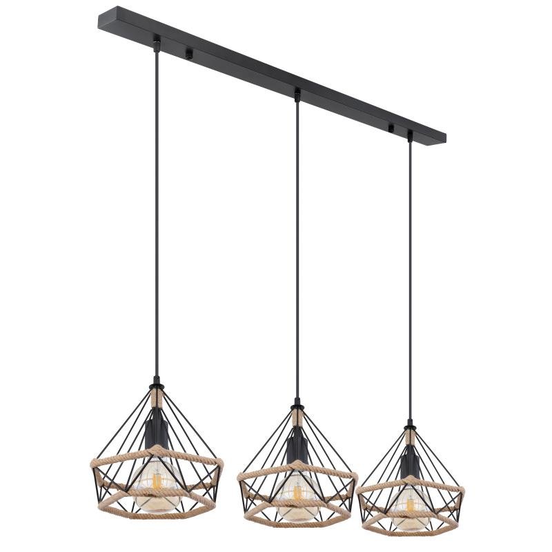 Závěsné svítidlo, kov matný černý, konopné lano hnědé, DxŠxV: 1000x250x1200, bez žárovek 3xE27, max. 40W 230V