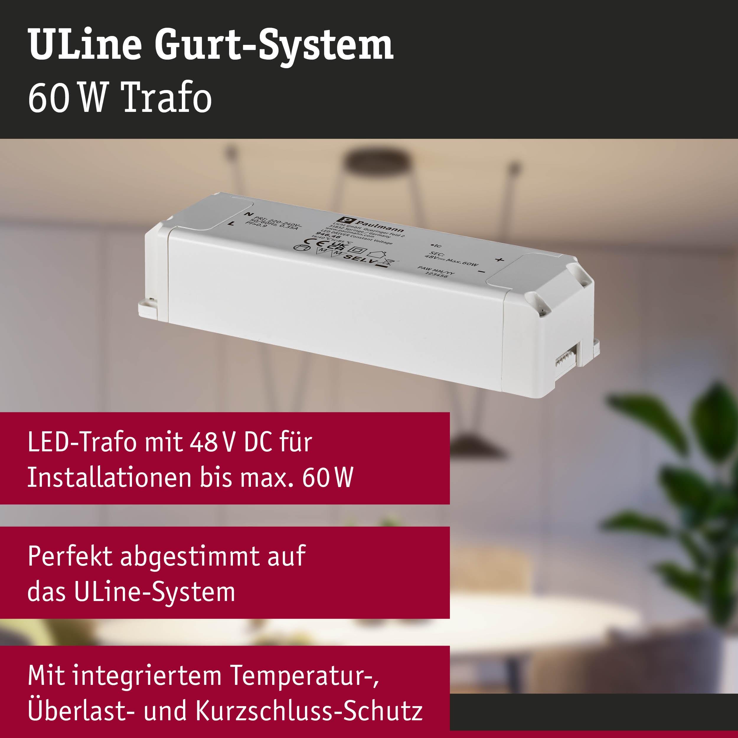 Vysoce kvalitní a výkonný transformátor Paulmann ULine 60VA je ideální volbou pro napájení inovativního ULine Gurt-Systému. Je navržen tak, aby spolehlivě obsloužil individuální světelné instalace o výkonu až 60 W a poskytl jim stabilní a bezpečné napájení.