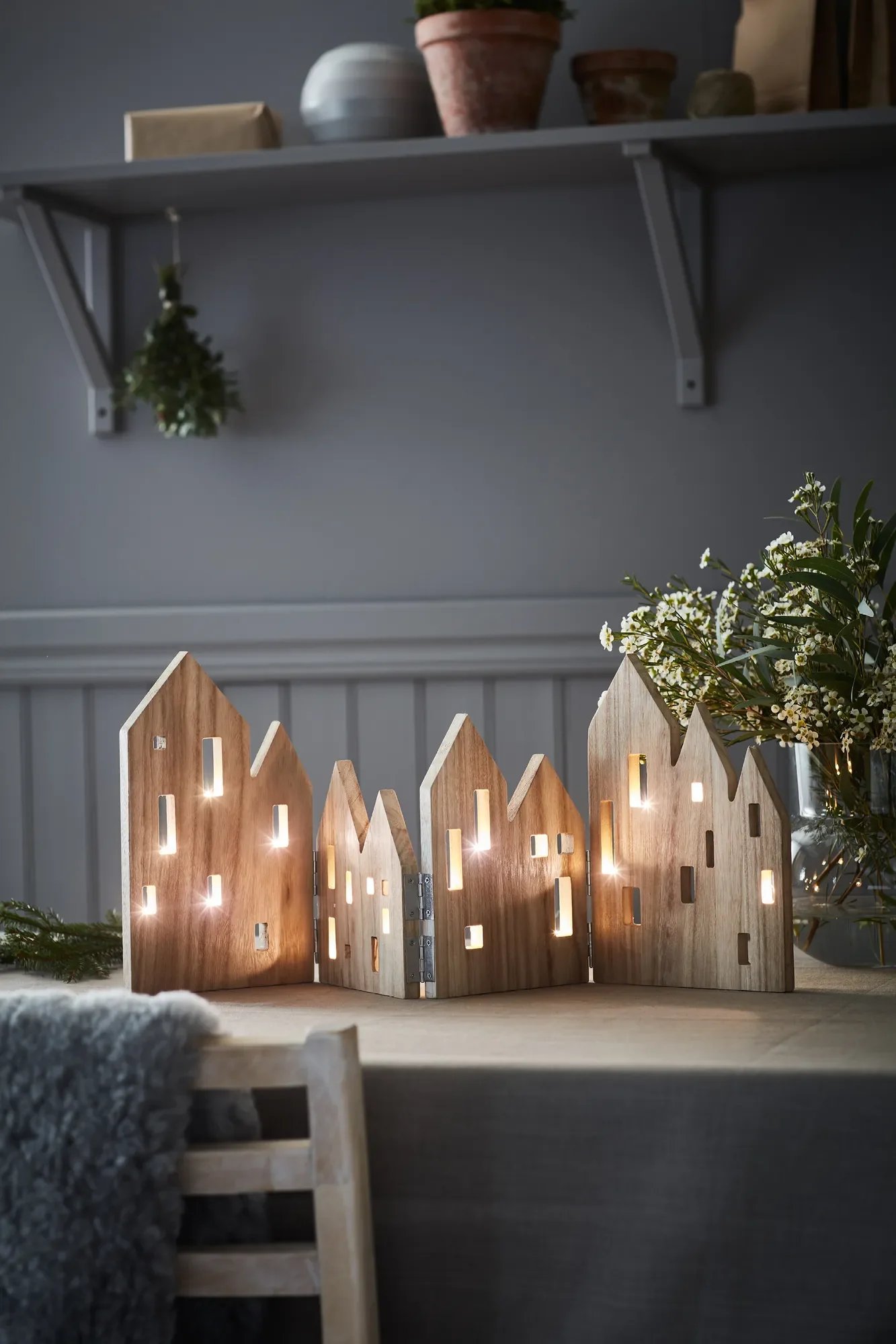 Vneste do svého interiéru kouzlo minimalistických Vánoc s vánoční dekorací View od renomované švédské značky Markslöjd. Tato stylová dekorace v přírodní barvě z masivní borovice je inspirovaná siluetou městských domů a díky svému skládacímu designu je nejen vizuálně působivá, ale také velmi praktická. Osvětlení zajišťuje 20 teplých LED diod, které vytvářejí příjemnou atmosféru jak na jídelním stole, tak v okně.