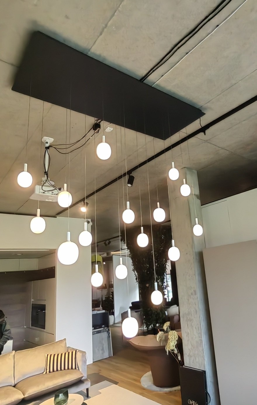 Sada svítidel IVY SINGLE - Barva skla: triplex opál, Povrchová úprava skla: matovaný oboustranný povrch skloviny, Povrch montury: kov - bílý matný komaxit, Barva el. vedení: koaxiální kabel - stříbrný. Celkem 7ks "S", 7ks "M" a 3ks "L" na baldachýnu CP19444.